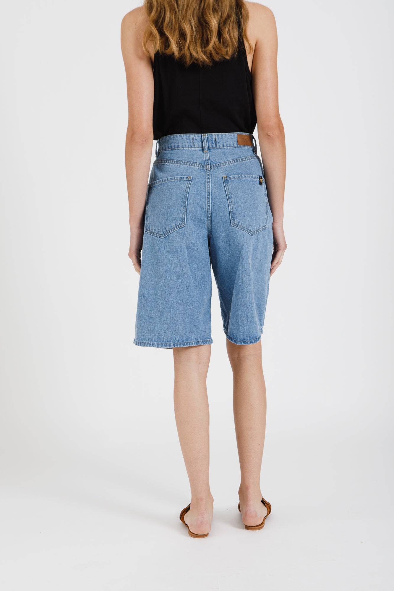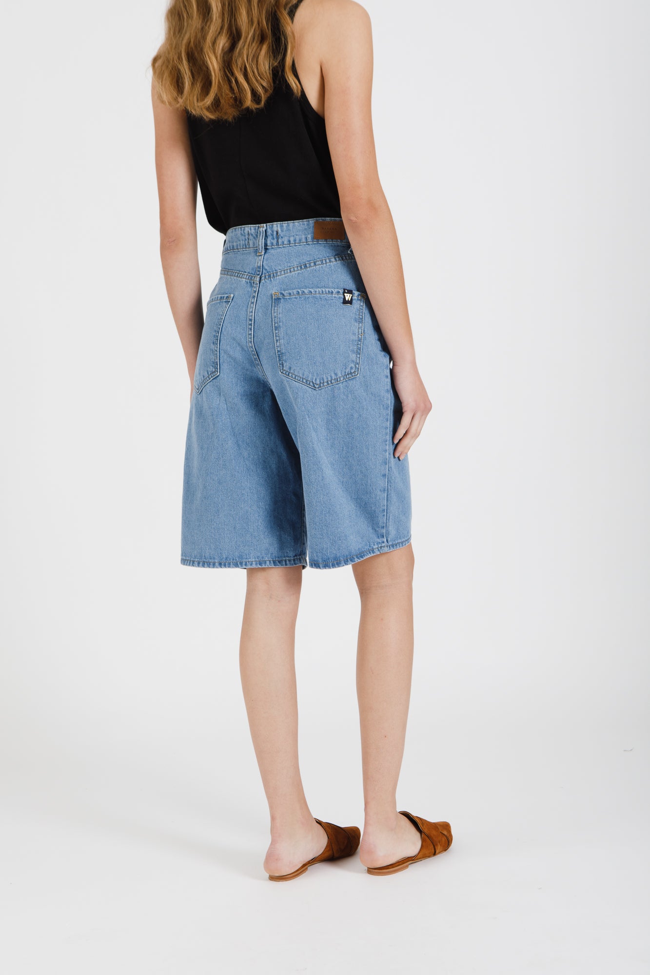 BERMUDA DE JEAN TIRO ALTO DE CALCE SUELTO EN PIERNAS TIPO ACAMPANADO. LARGO HASTA LA RODILLA.