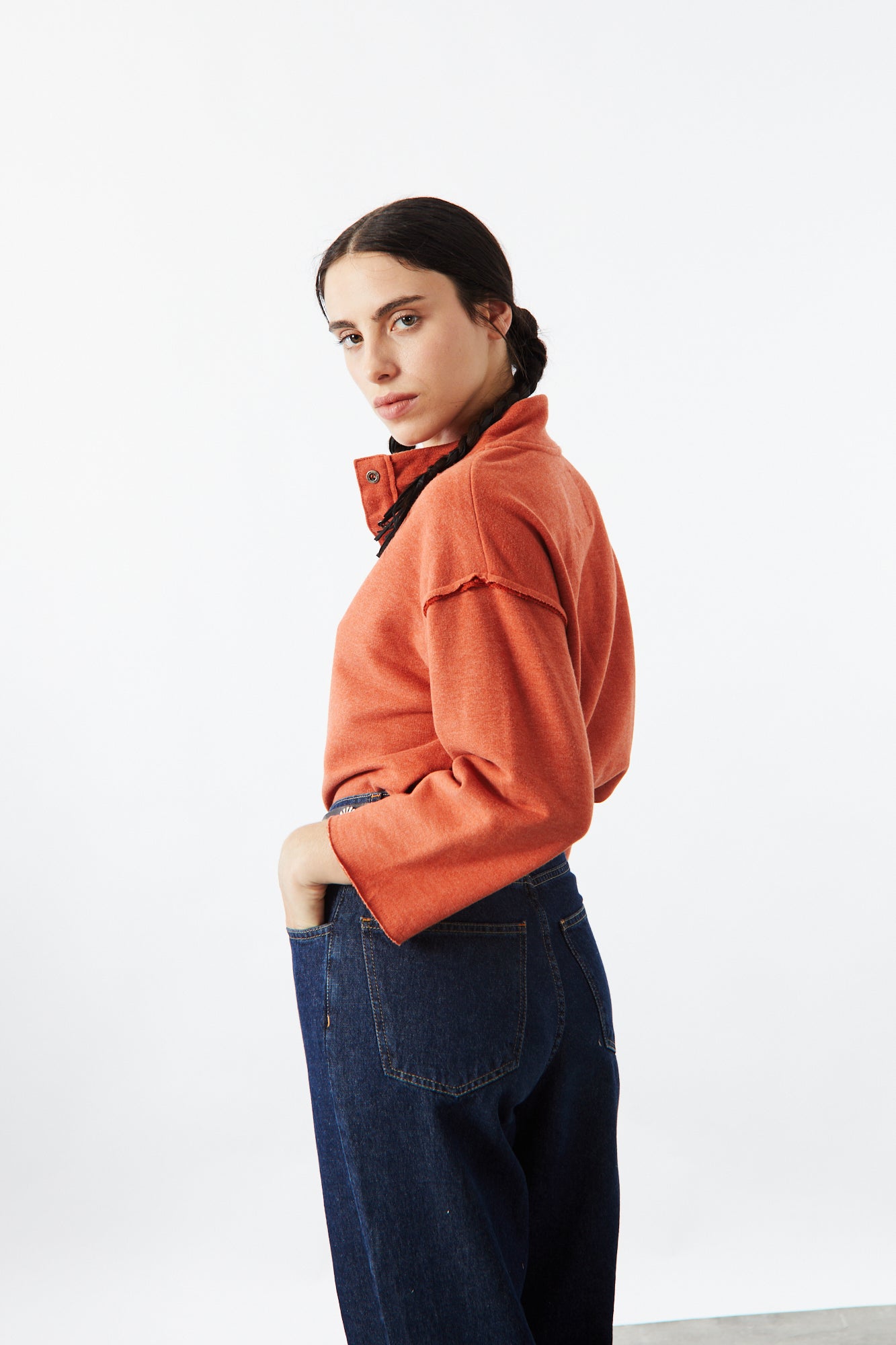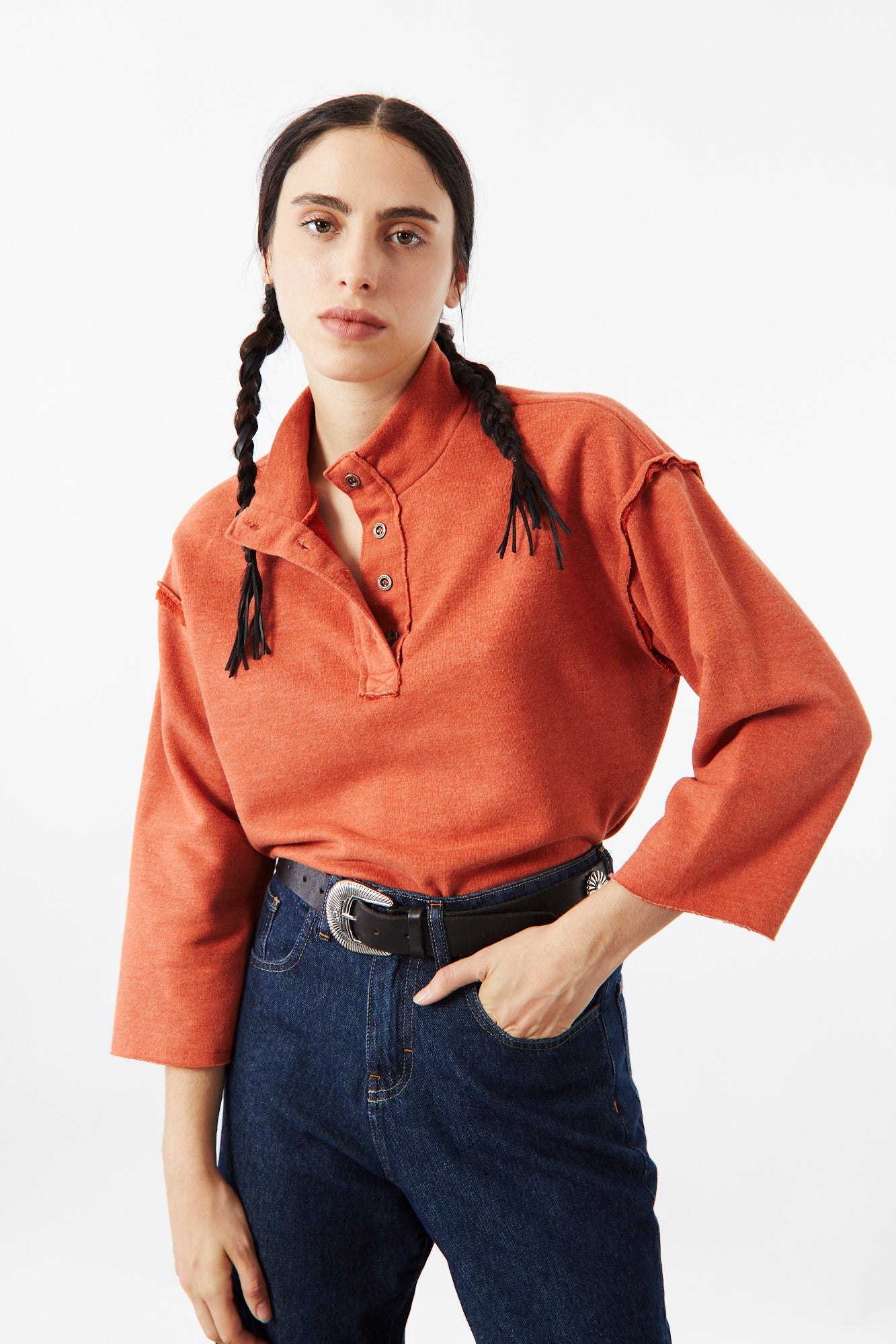 BUZO CANYON TONO LADRILLO INTENSO EN TEJIDO SUAVE CON CORTE CLÁSICO Y DETALLE EN COSTURAS A LA VISTA PARA UN ESTILO NATURAL Y RELAJADO