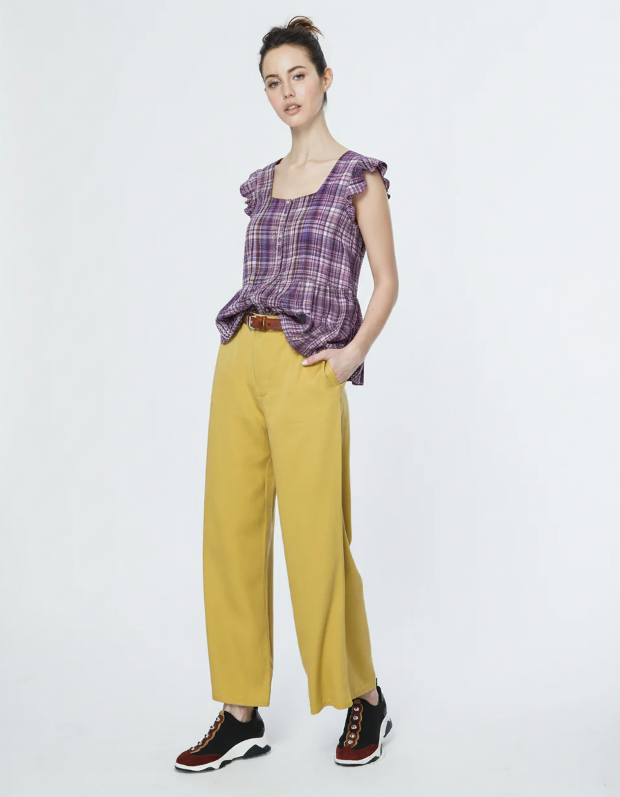 CAMISA DE CUADROS EN TONOS VIOLETAS CON ESCOTE CUADRADO Y DETALLE DE VOLADOS EN LAS MANGAS. IDEAL PARA UN ESTILO BOHEMIO Y RELAJADO.