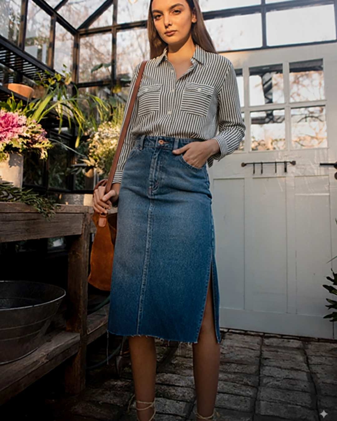 CAMISA RAYADO EN TONOS NEUTROS CON BOLSILLOS FRONTALES Y BOTONES CLÁSICOS.