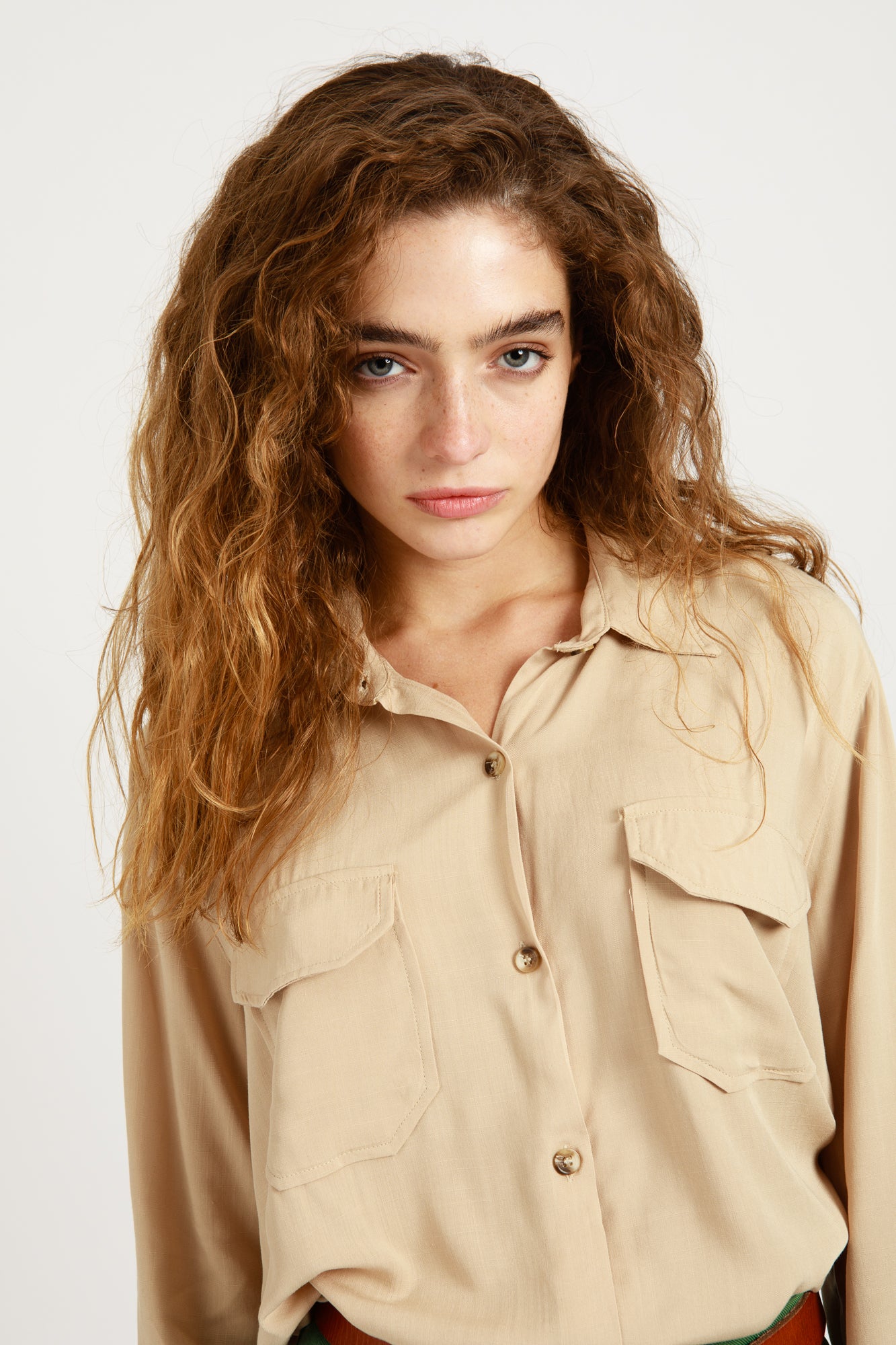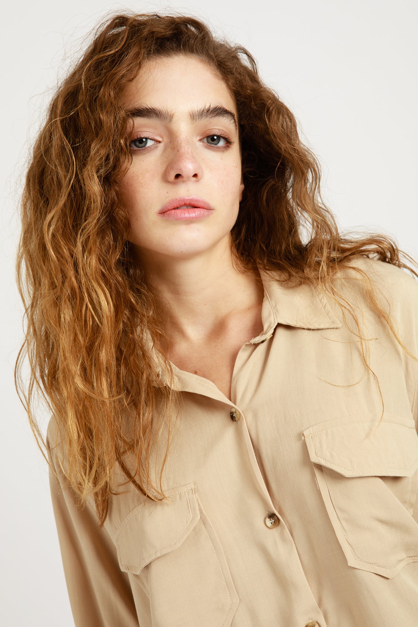 CAMISA CONFECCIONADA EN RAYON, MANGA LARGA, HOMBRO CAIDO. CON BOLSILLOS PLAQUE + TAPA.