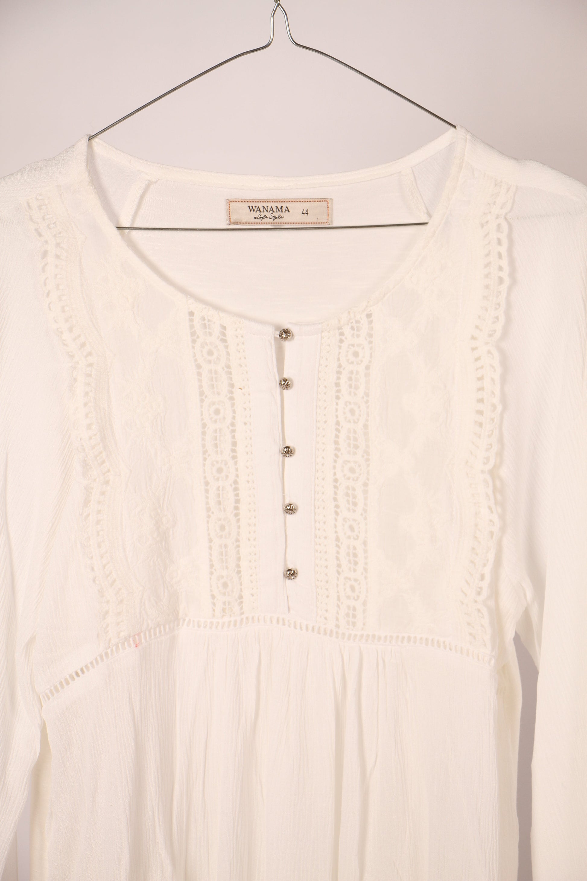 CAMISA CONFECCIONADA EN ALGODON Y CON TERMINACIONES EN PUNTILLA. CALCE SUELTO CON MANGAS BALLOON, Y ACCESO DELANTERO POR CARTERA A LA VISTA.