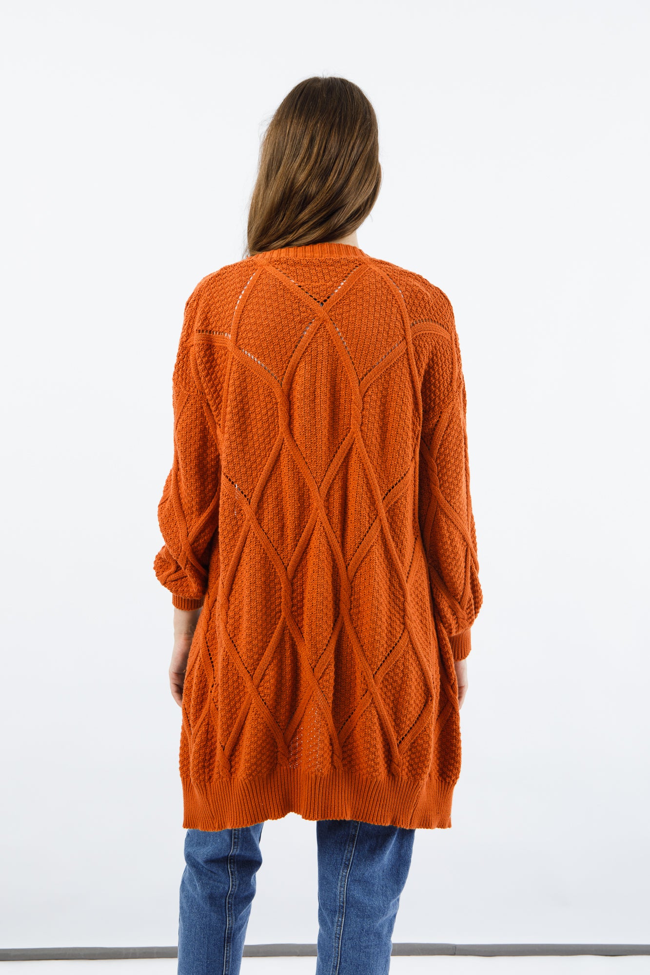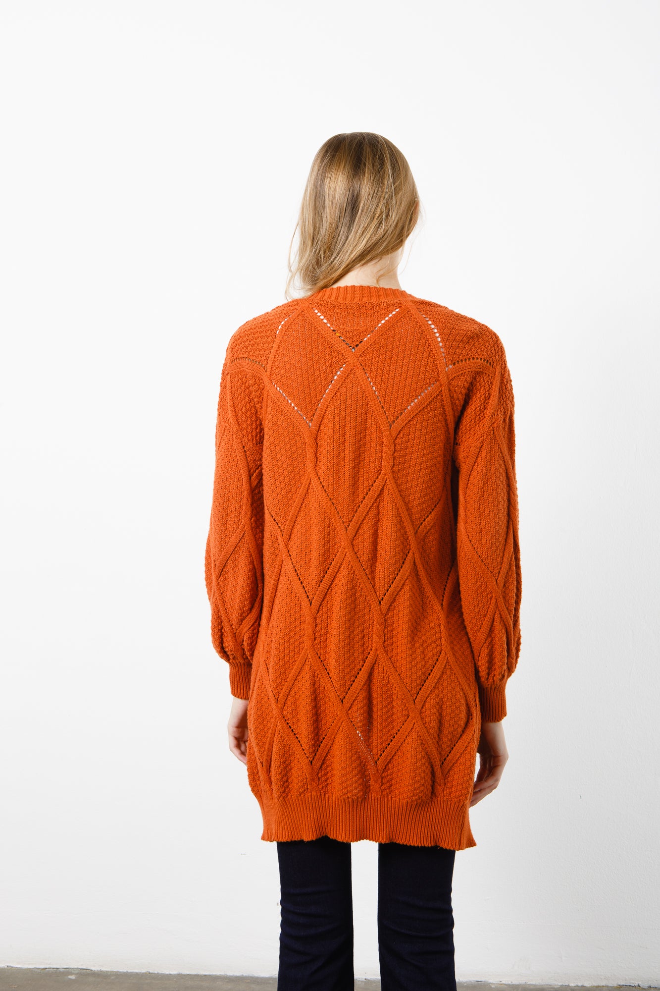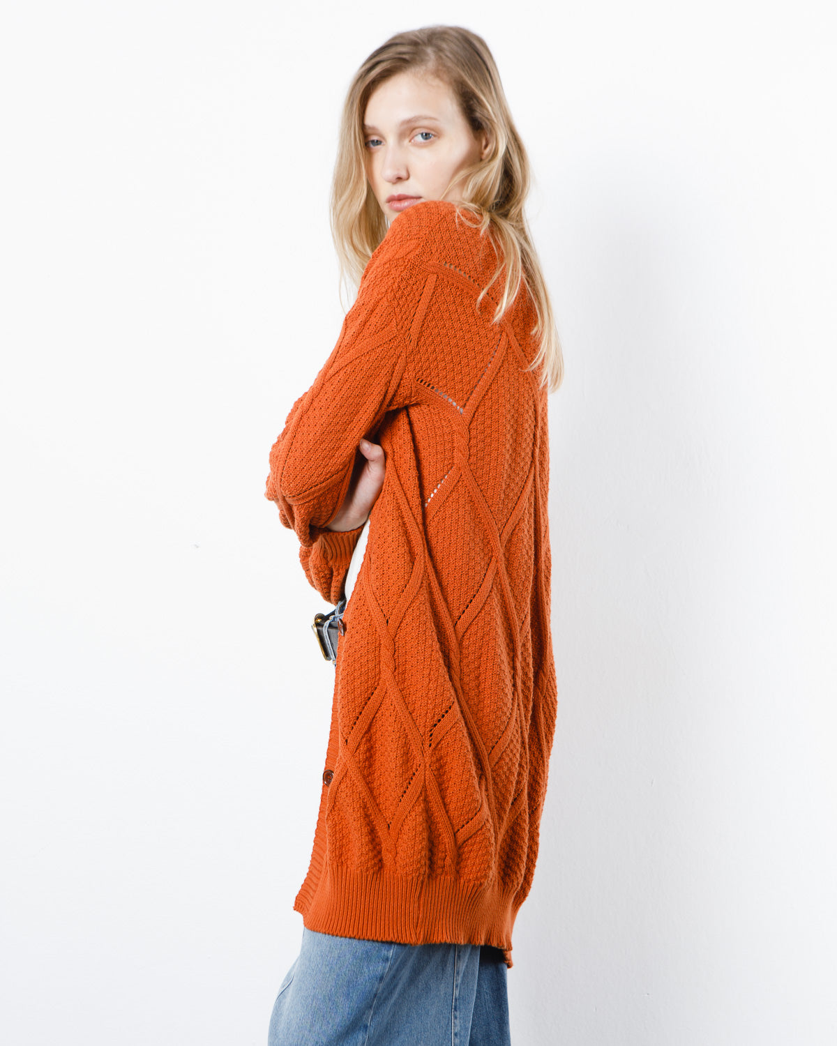 CARDIGAN TEJIDO DE ALGODÓN, CON CALCE HOLGADO. CARTERA A LA VISTA Y DOS BOTONES. MANGAS LARGAS.