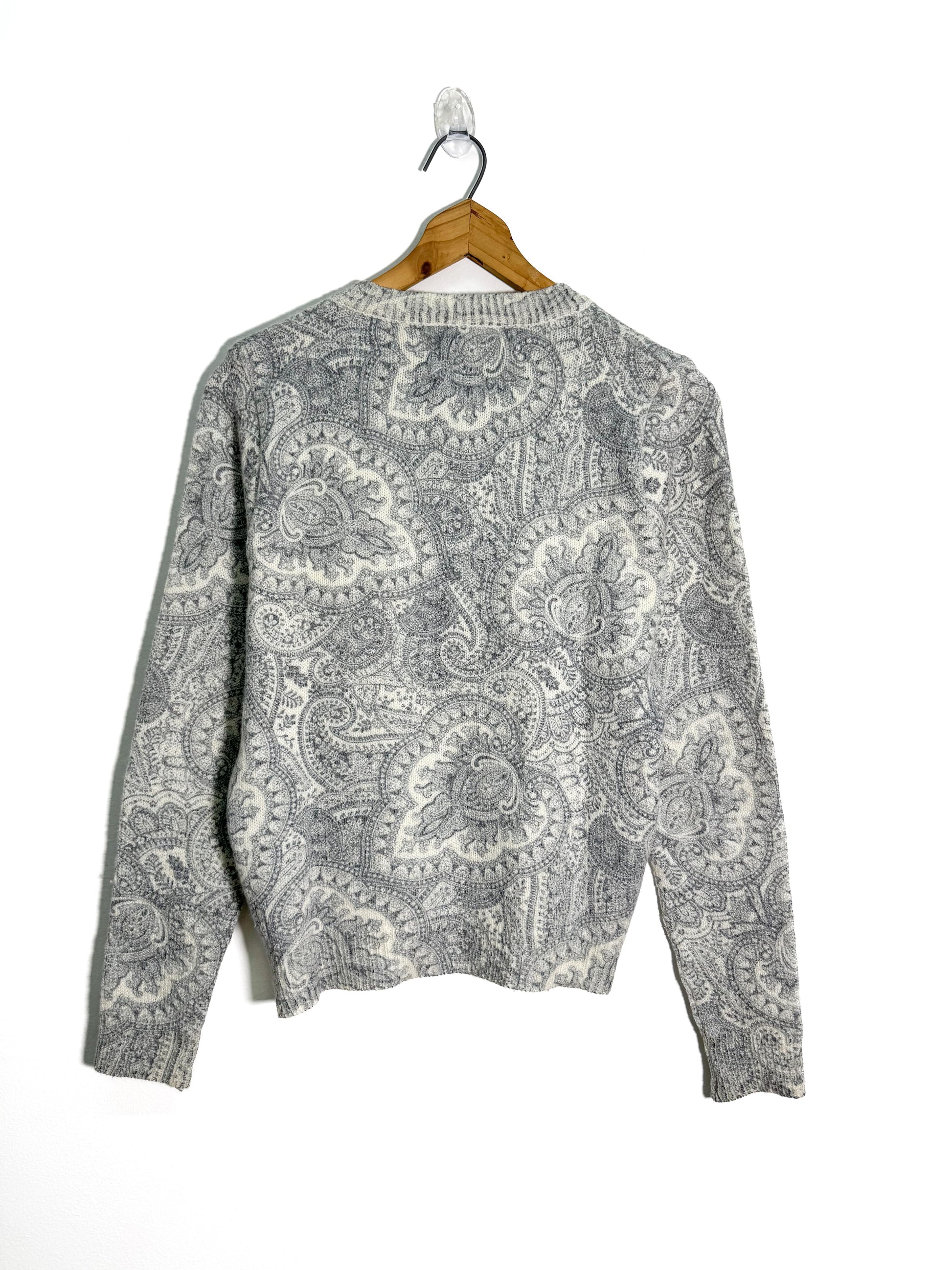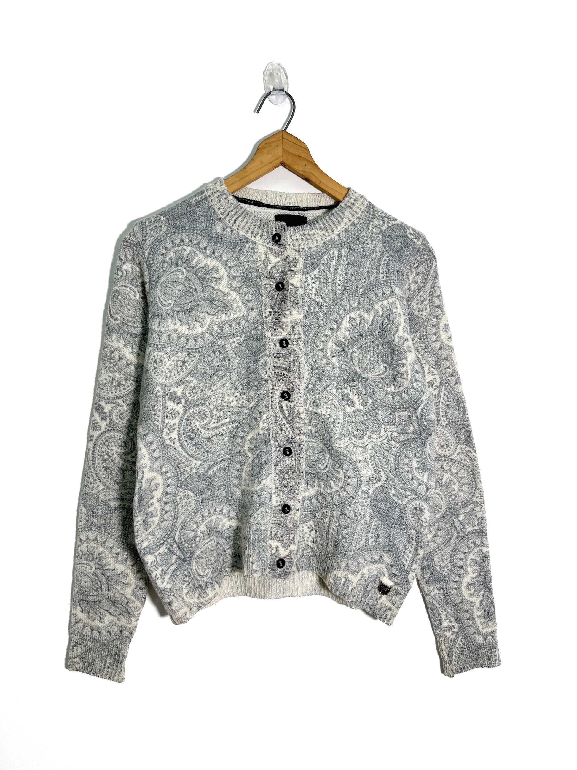 CARDIGAN TRAMA CACHEMIRA EN GRIS CLARO Y OSCURO CON TEJIDO SUAVE Y BOTONES FRONTALES.
