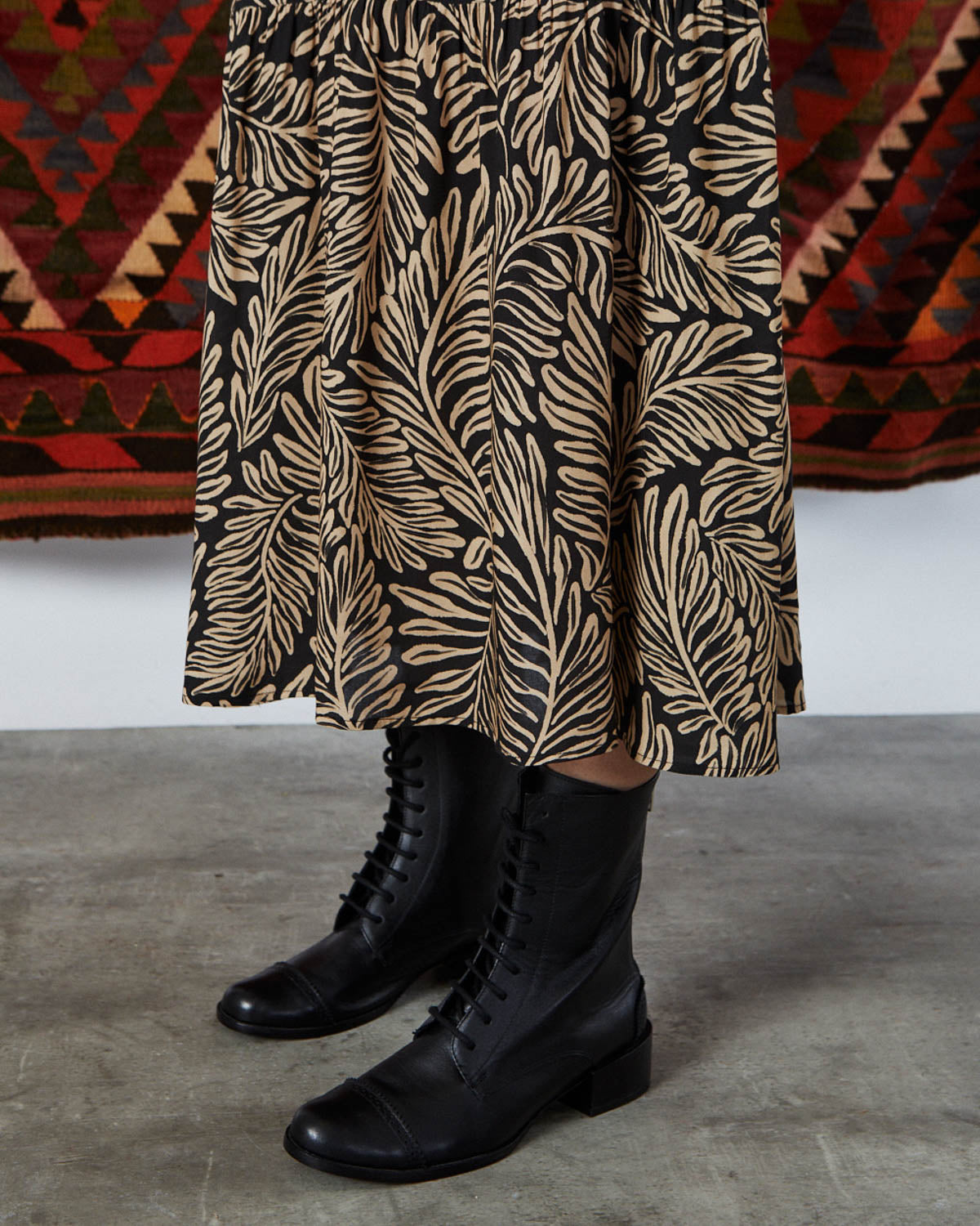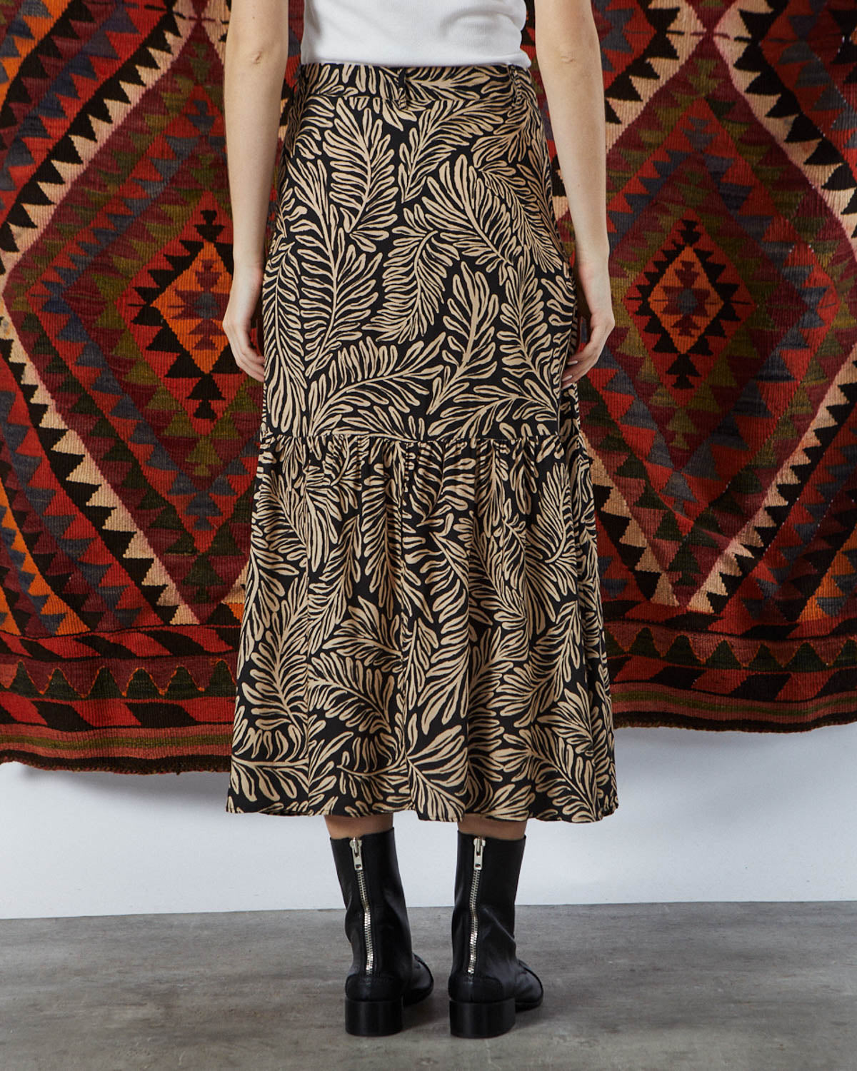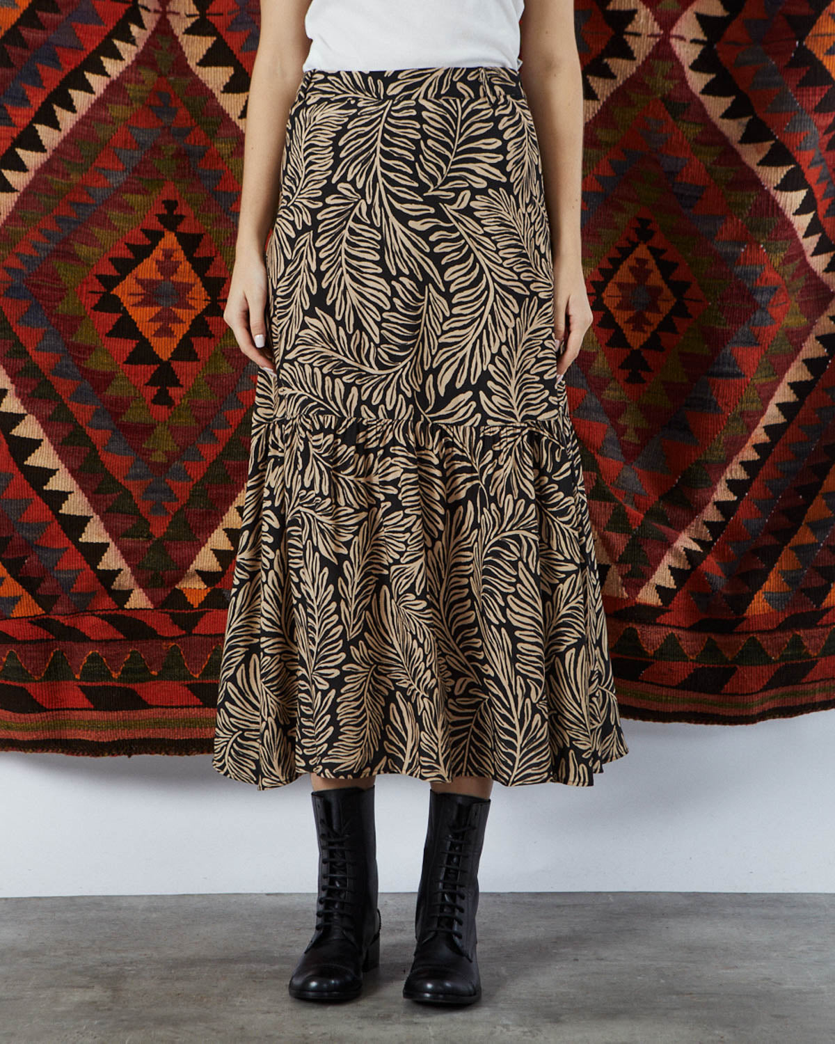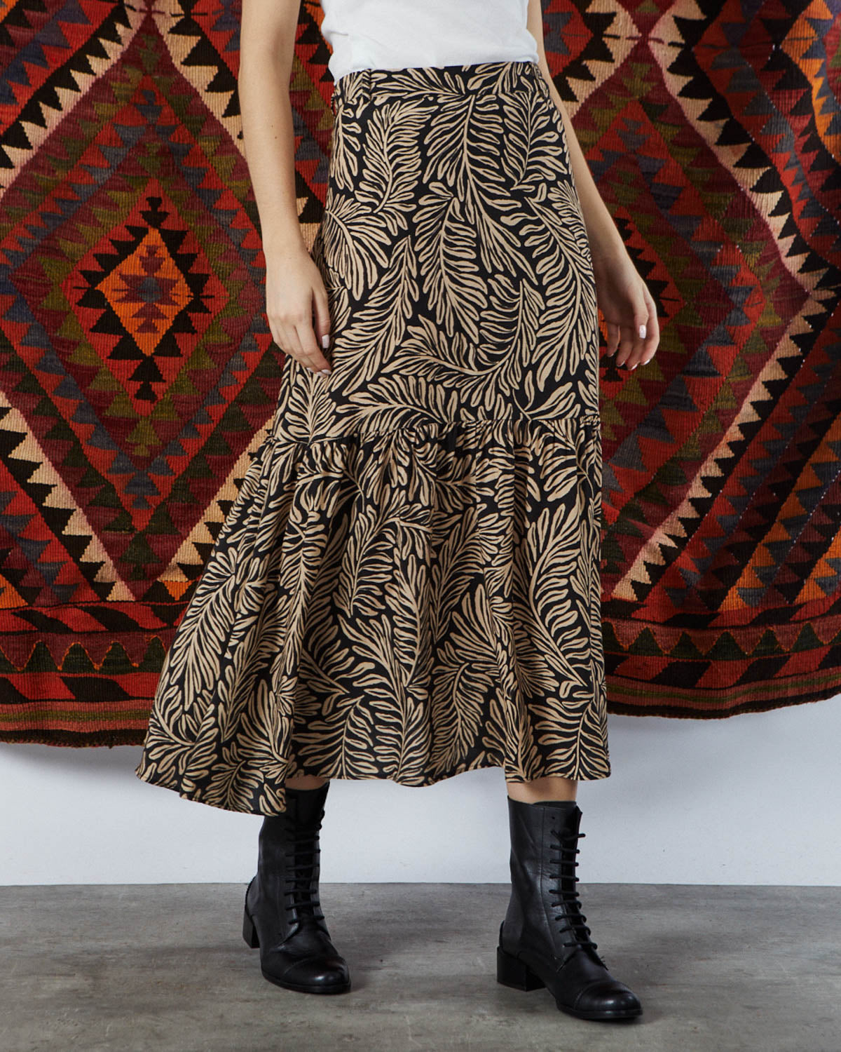 FALDA LARGA CONFECCIONADA EN VOILE DE VISCOSA ESTAMPADA CON VOLADO INFERIOR, PRESILLAS PARA CINTO Y CIERRE INVISIBLE.