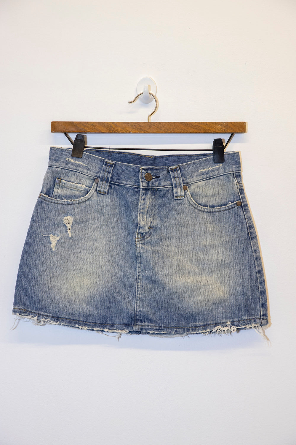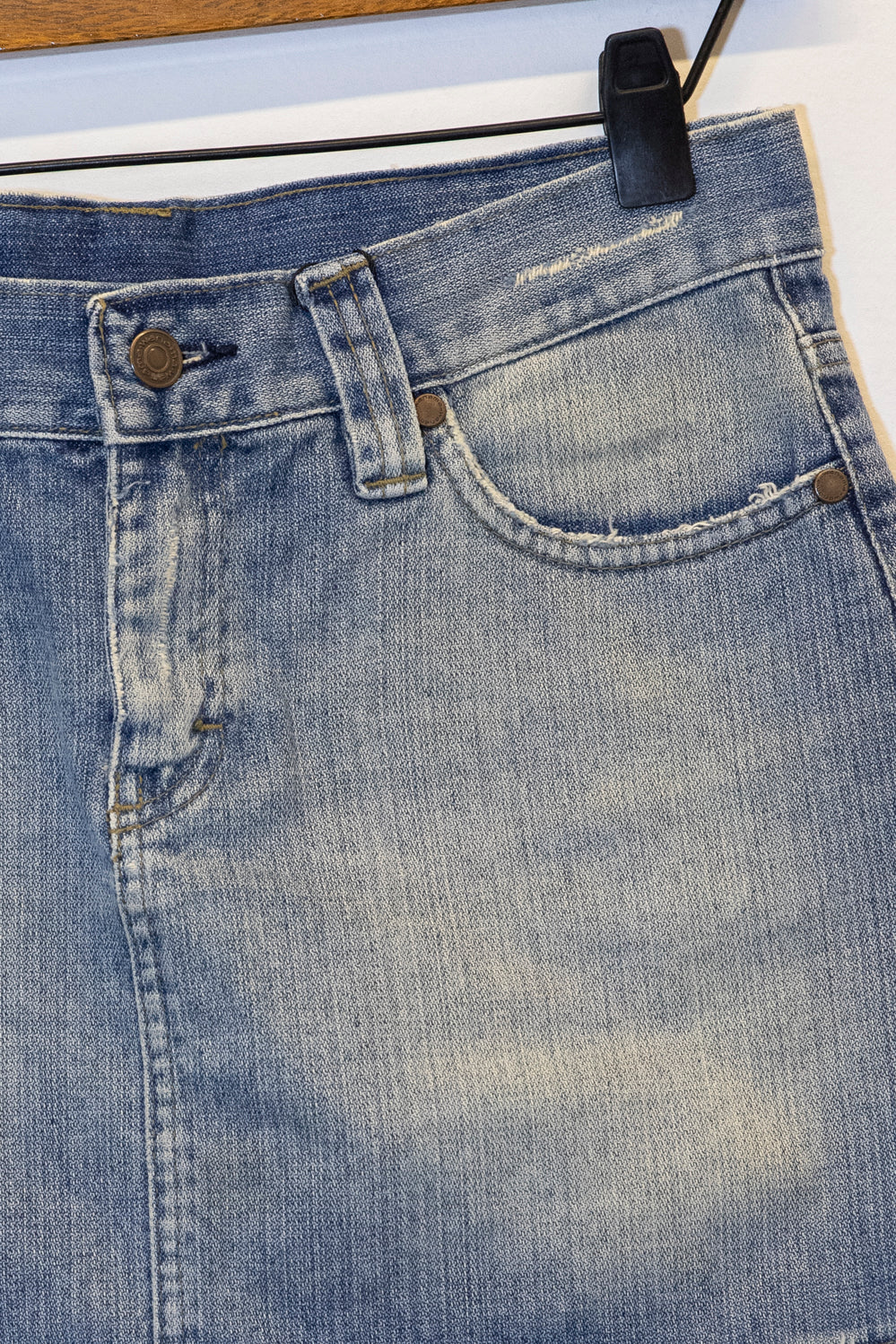 Falda corta confeccionada en denim, con un diseño clásico y detalles desgastados que le dan un toque moderno. Posee bolsillos delanteros y traseros, con un distintivo bordado en forma de 'W' en los bolsillos traseros. Ideal para un look casual y juvenil.
