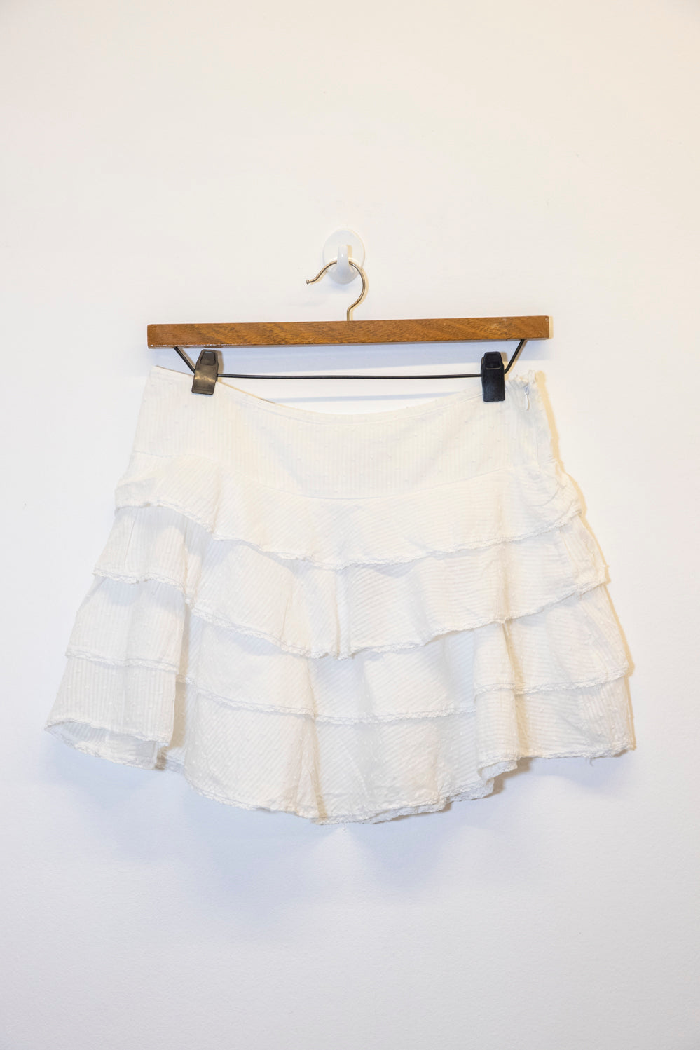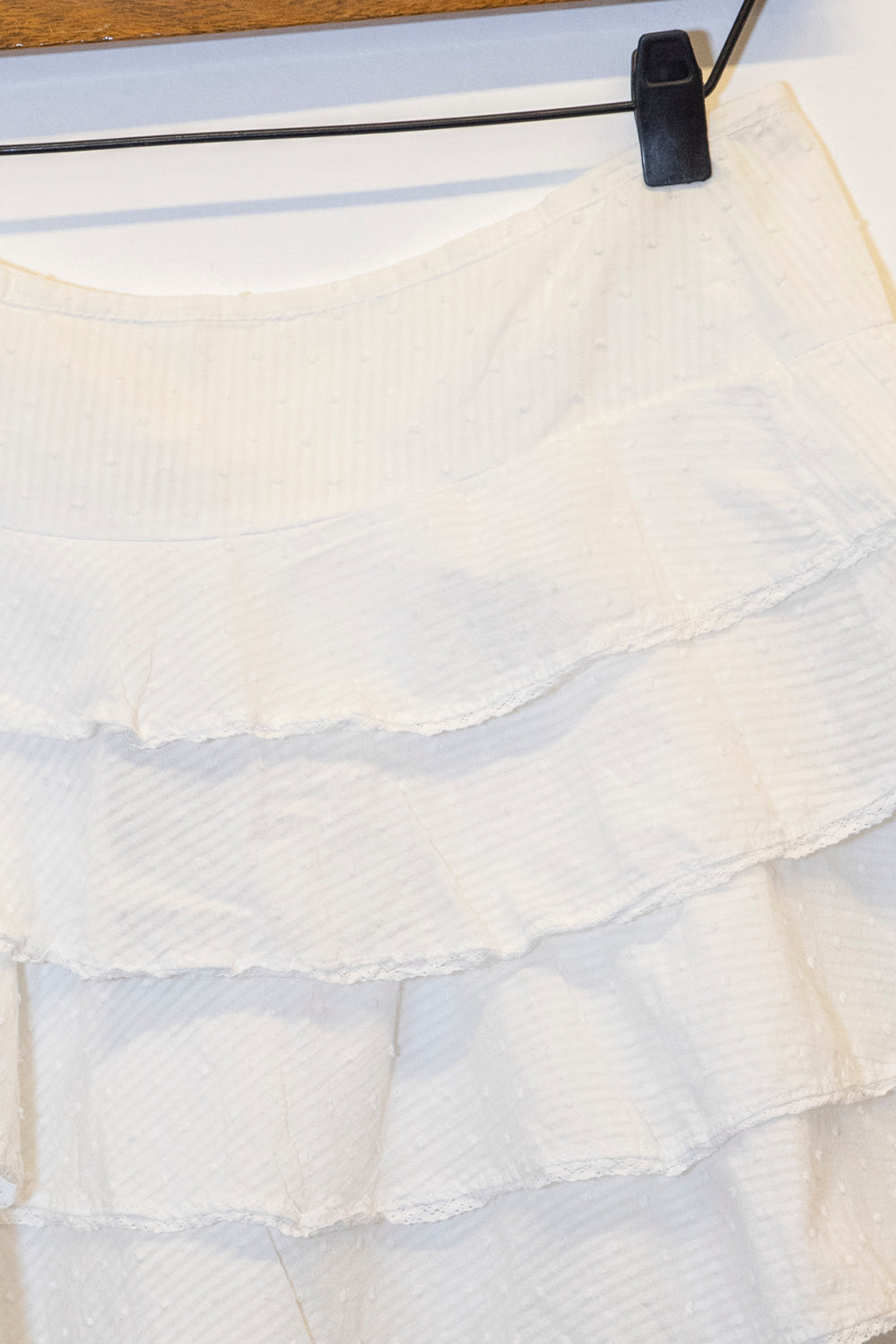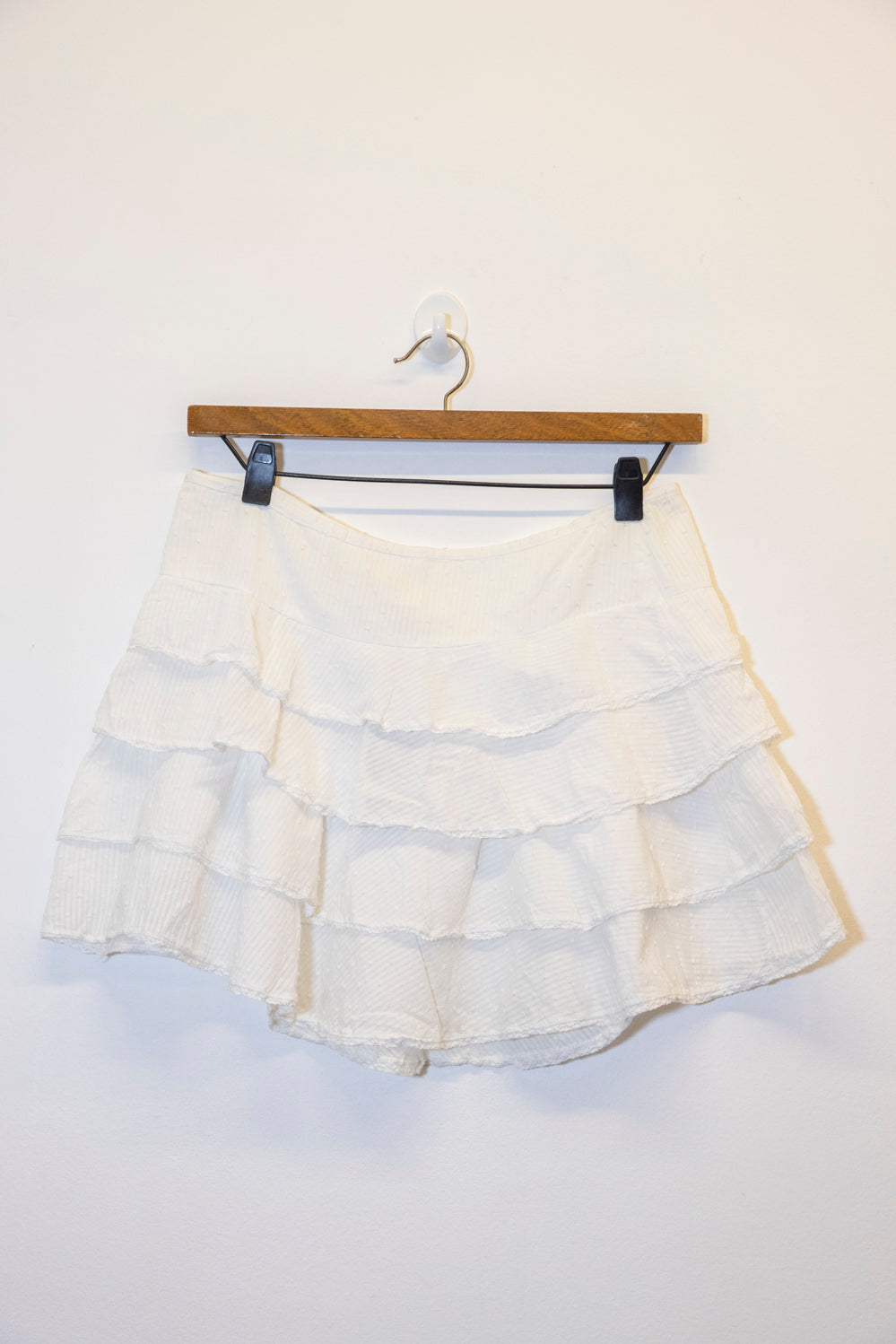 Falda corta con múltiples volados, confeccionada en tejido con textura sutil. Diseño fresco y femenino, ideal para looks de verano. Perfecta para combinar con tops y sandalias, creando un estilo casual y elegante. Un básico imprescindible en tu guardarropa.