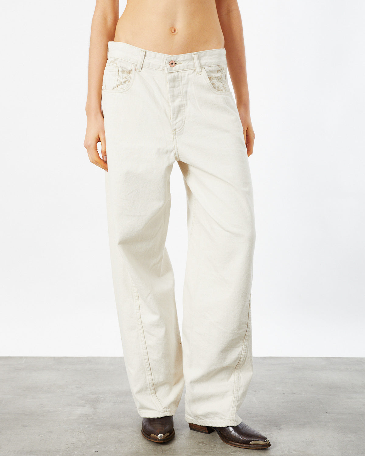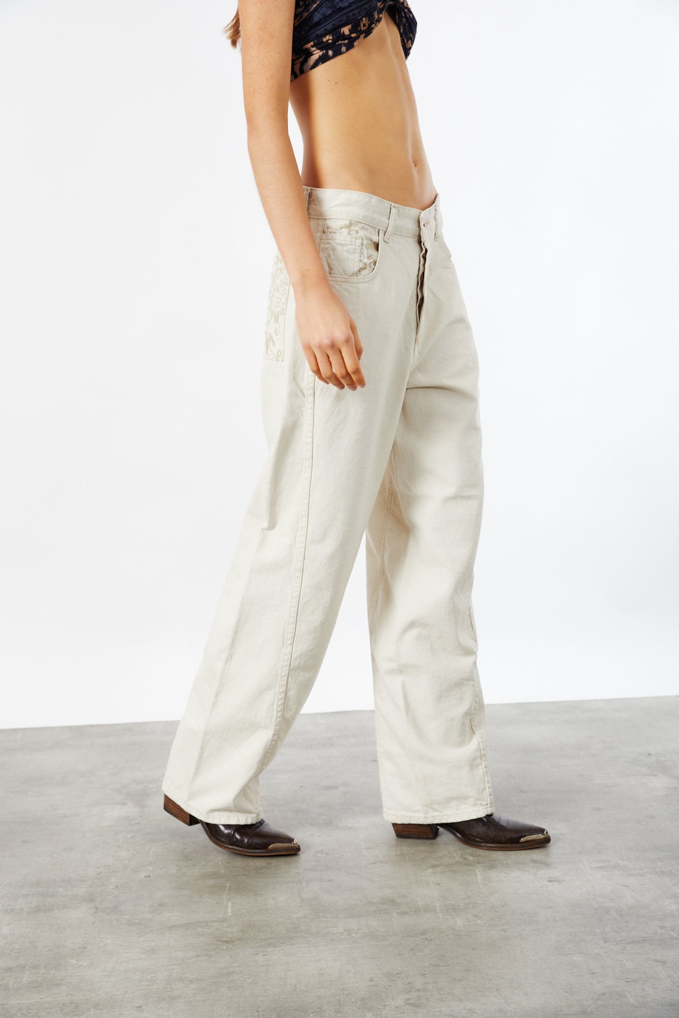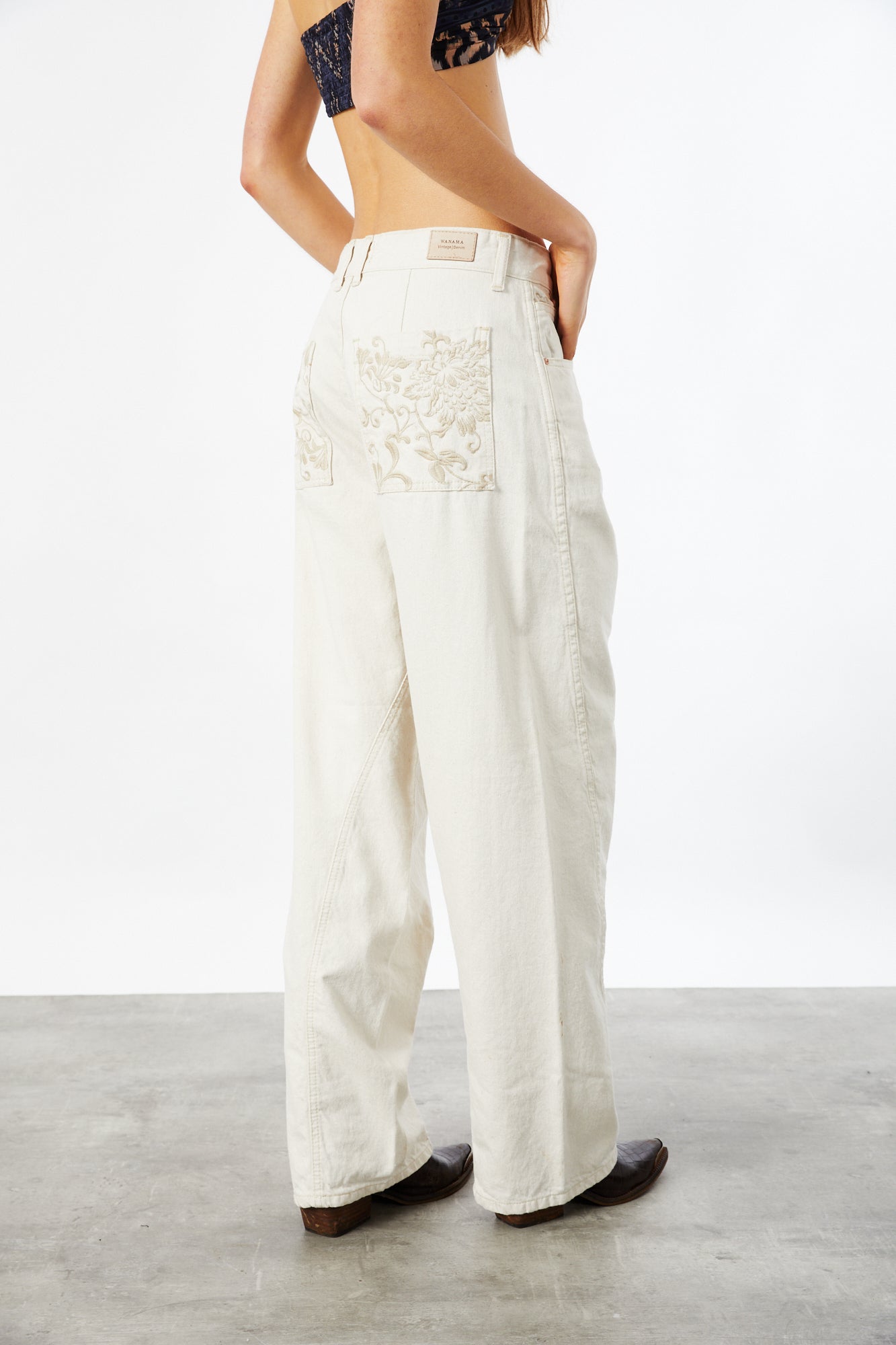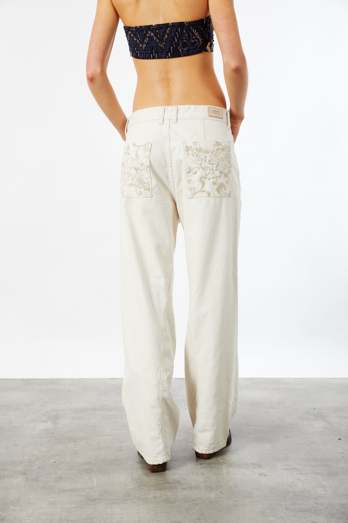 JEAN CONFECCIONADO EN CASCARILLA, CON COSTURAS GIRADAS. PESPUNTES CONTRATONO. CALCE HOLGADO; SUPER COMODO. TIRO MEDIO. BOLSILLOS TRASEROS Y VISTAS DELANTERAS BORDADAS.
