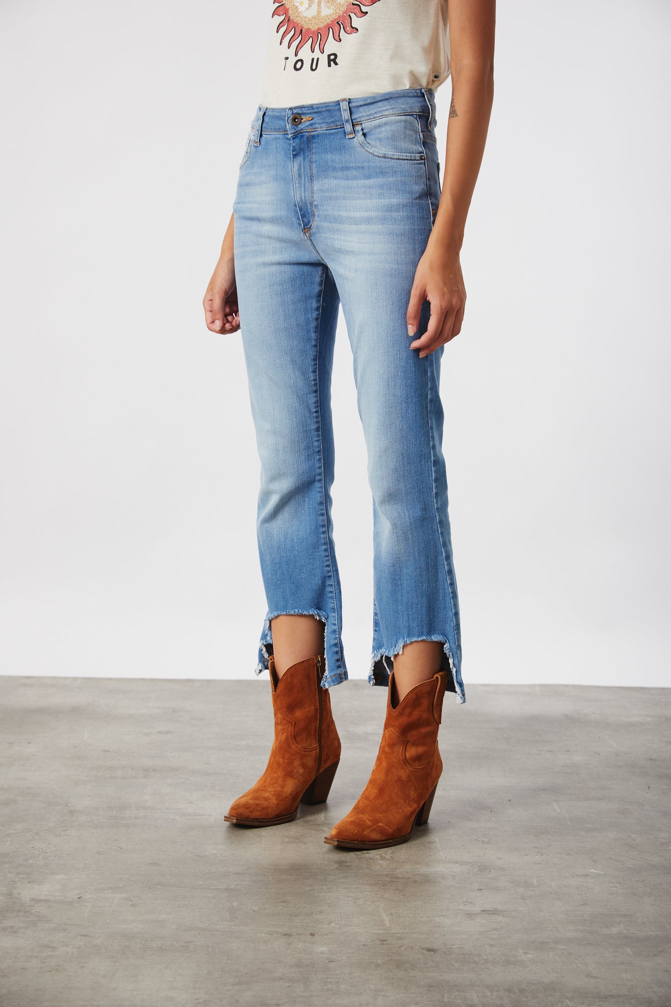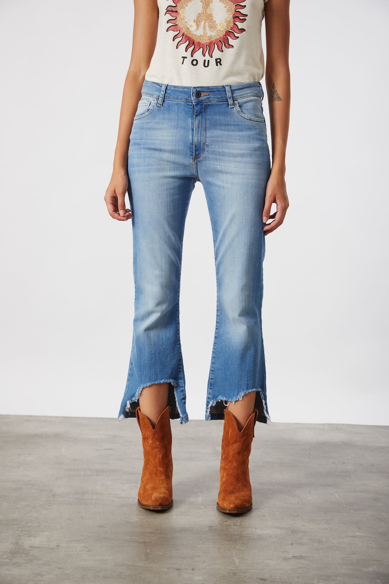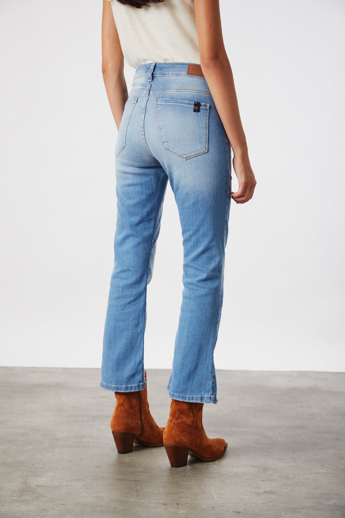 CALCE BOOT CUT, MID RISE. ESTILIZA EL CUERPO POR AJUSTAR EN LA PARTE SUPERIOR Y SU FORMA ACAMPANADA EN BOTA. TERMINACIONES DEFLECADAS EN DELANTERO Y CON RUEDO EN ESPALDA.
