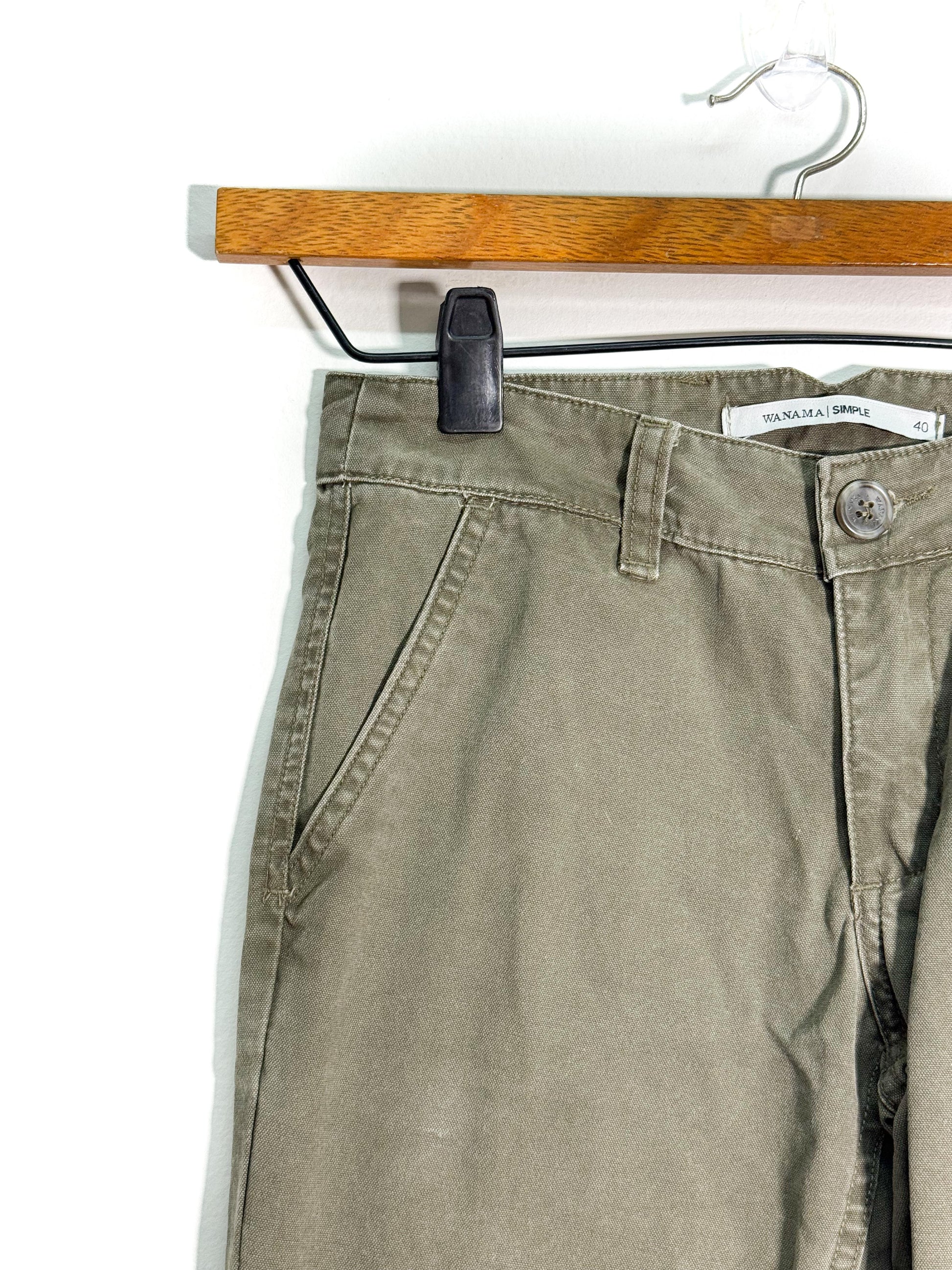 PANTALÓN ALGODÓN VERDOSO CON COSTURAS VISTAS Y CORTE RECTO, BOLSILLOS EN DIAGONAL.