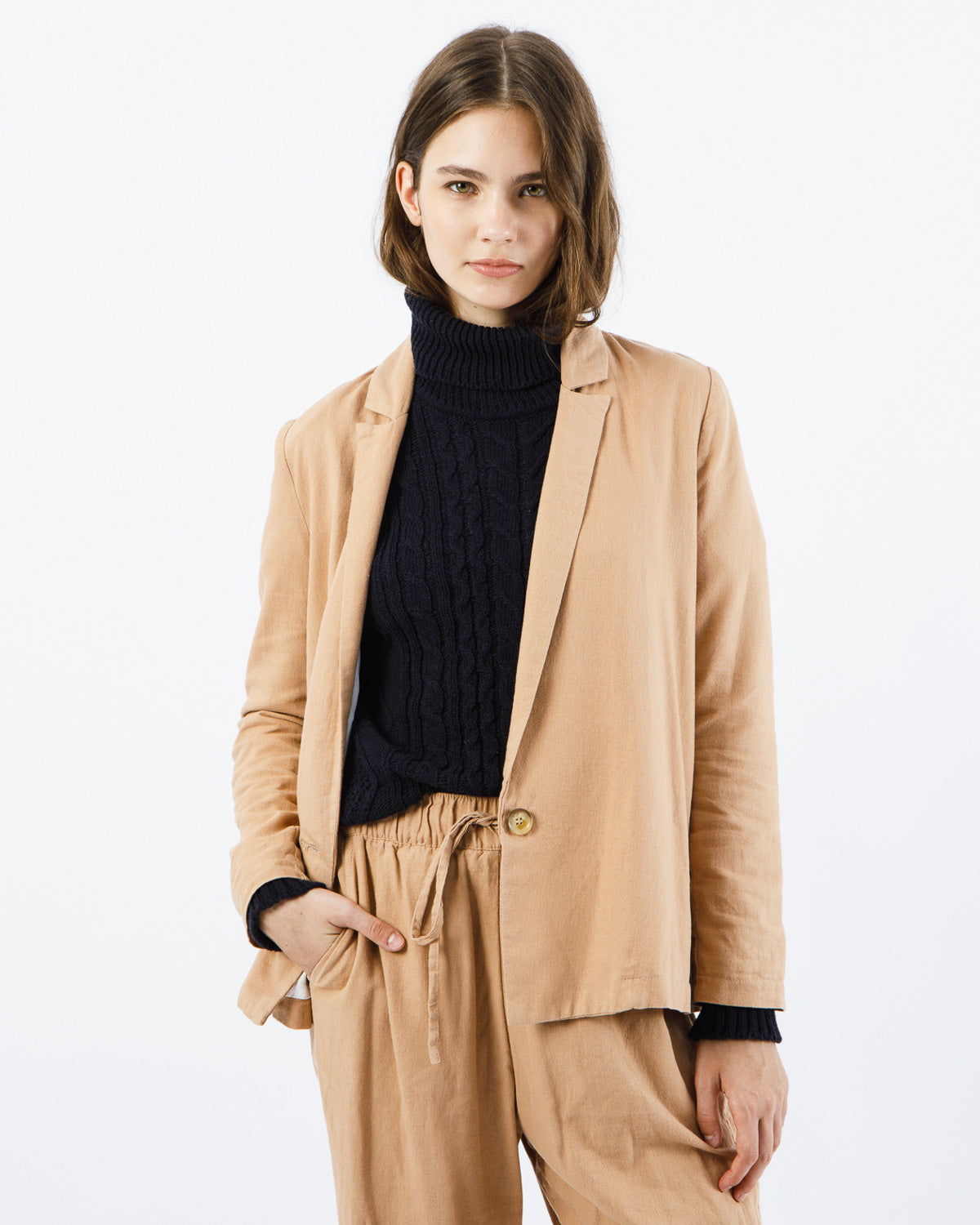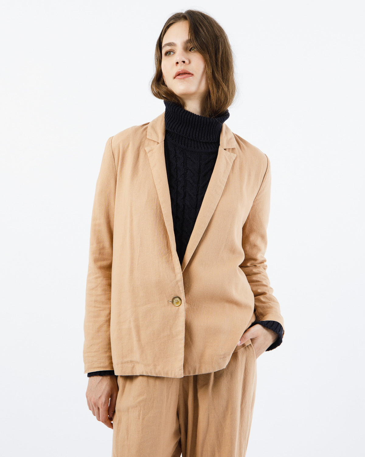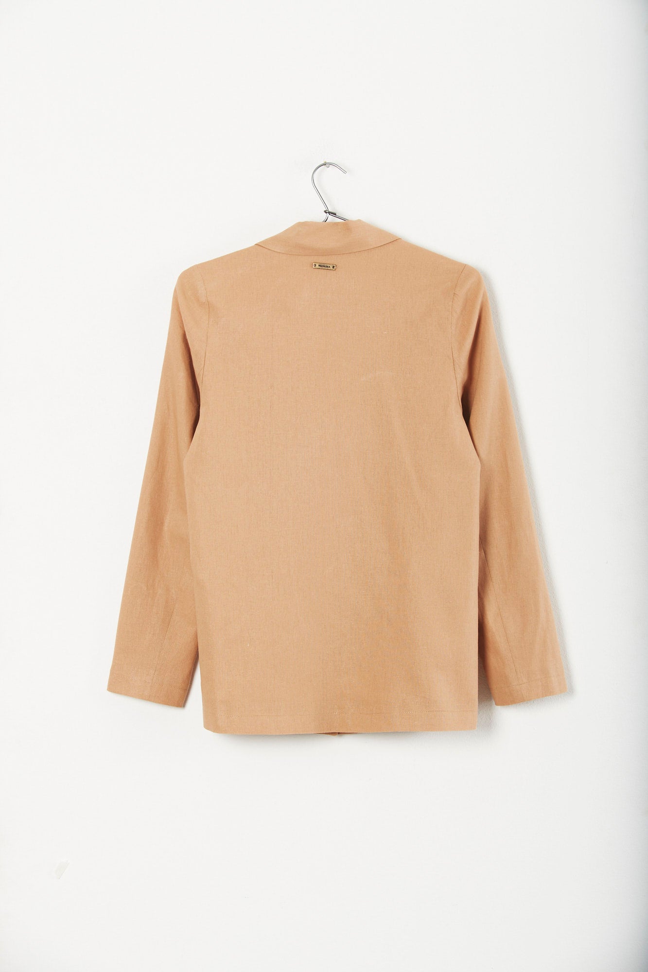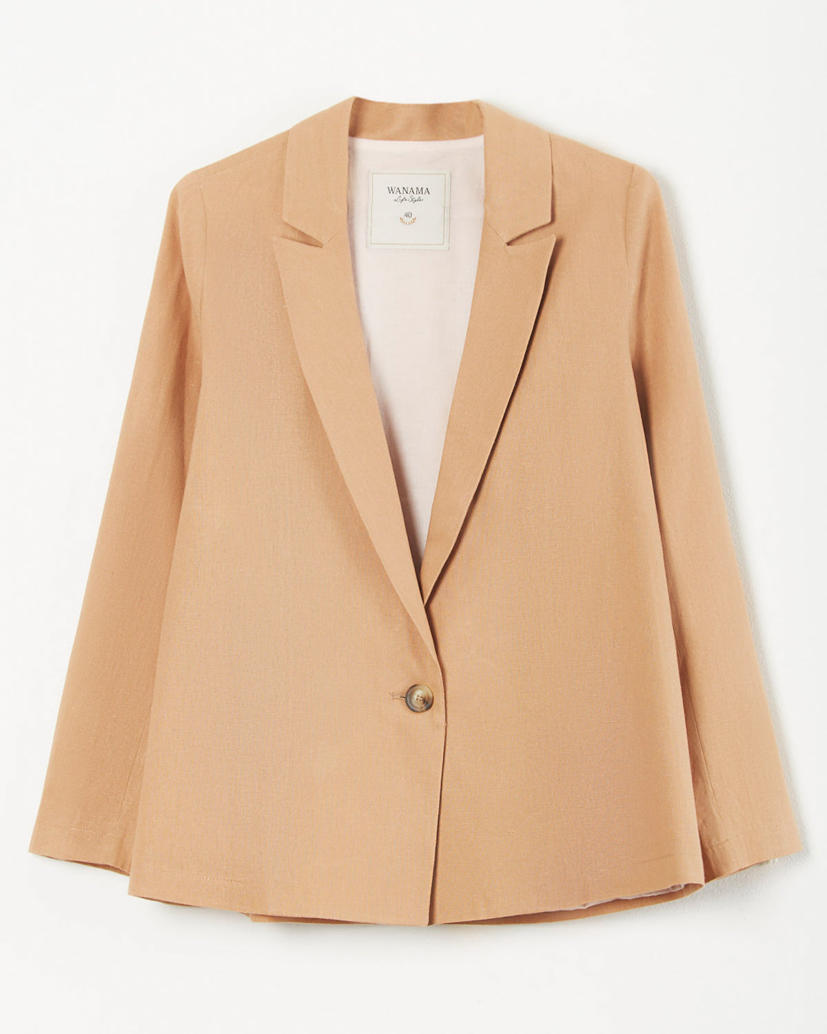SACO CONFECCIONADO CON CUELLO SOLAPA Y MANGAS LARGAS. PRESENTA UN CALCE SUELTO Y ESTRUCTURADO QUE BRINDA COMODIDAD Y ESTILO. SU DISEÑO INCLUYE ACCESO DELANTERO MEDIANTE UN ÚNICO BOTÓN CENTRAL. ES UNA PIEZA VERSÁTIL E ATEMPORAL, IDEAL PARA LOGRAR UN LOOK SOFISTICADO Y MODERNO EN CUALQUIER OCASIÓN.