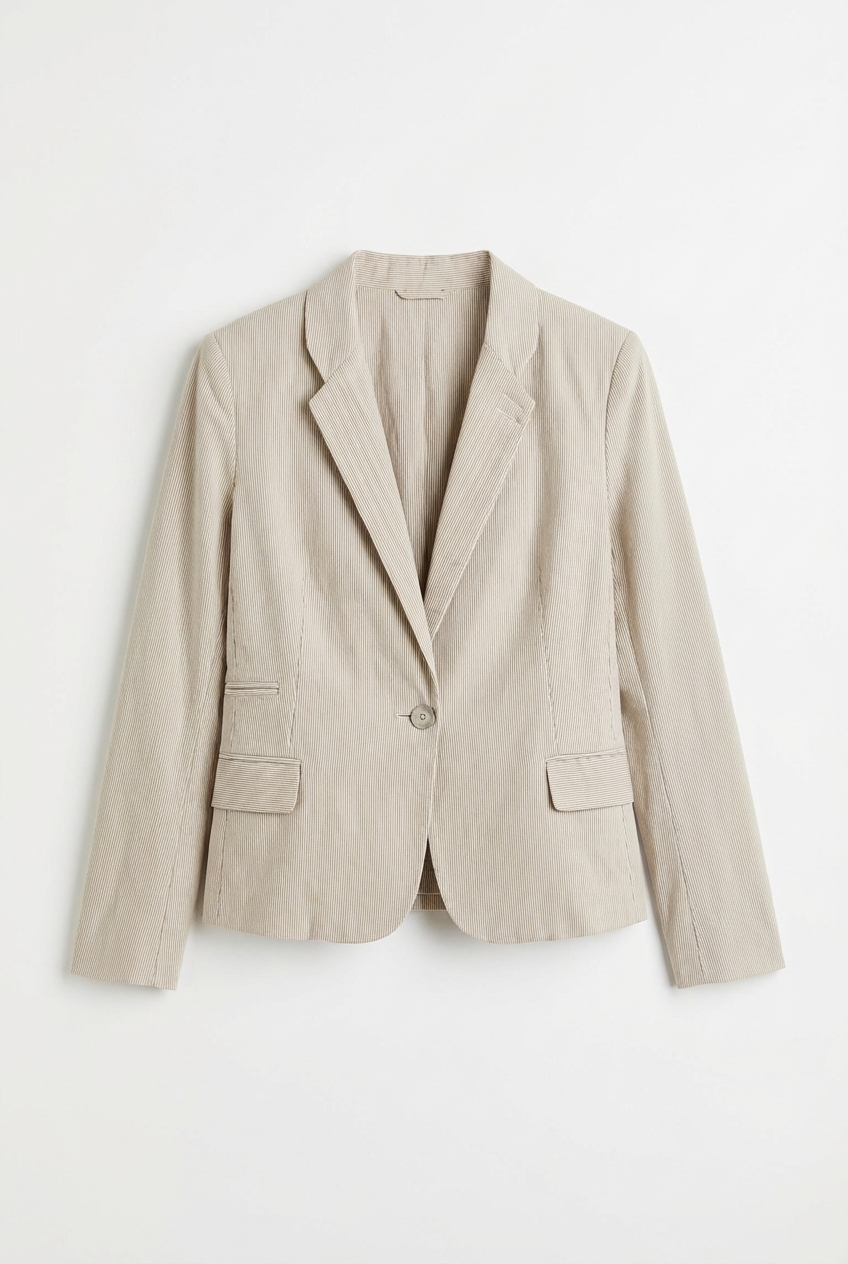 SACO SIENA DE CORTE SASTRE, IDEAL PARA UN LOOK SOFISTICADO Y VERSÁTIL. CUENTA CON CIERRE DE UN SOLO BOTÓN, SOLAPAS CLÁSICAS Y DOS PRÁCTICOS BOLSILLOS CON SOLAPA. SU DISEÑO INCORPORA UN ELEGANTE PATRÓN DE RAYAS VERTICALES, APORTANDO UNA TEXTURA ÚNICA Y UN TOQUE DISTINTIVO.