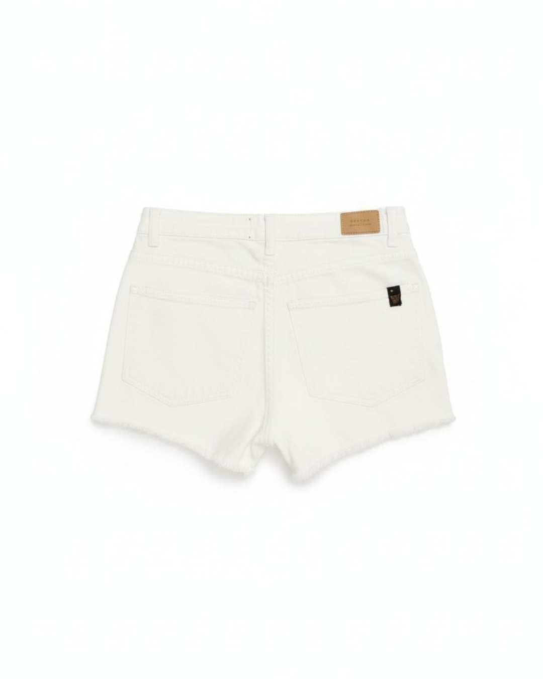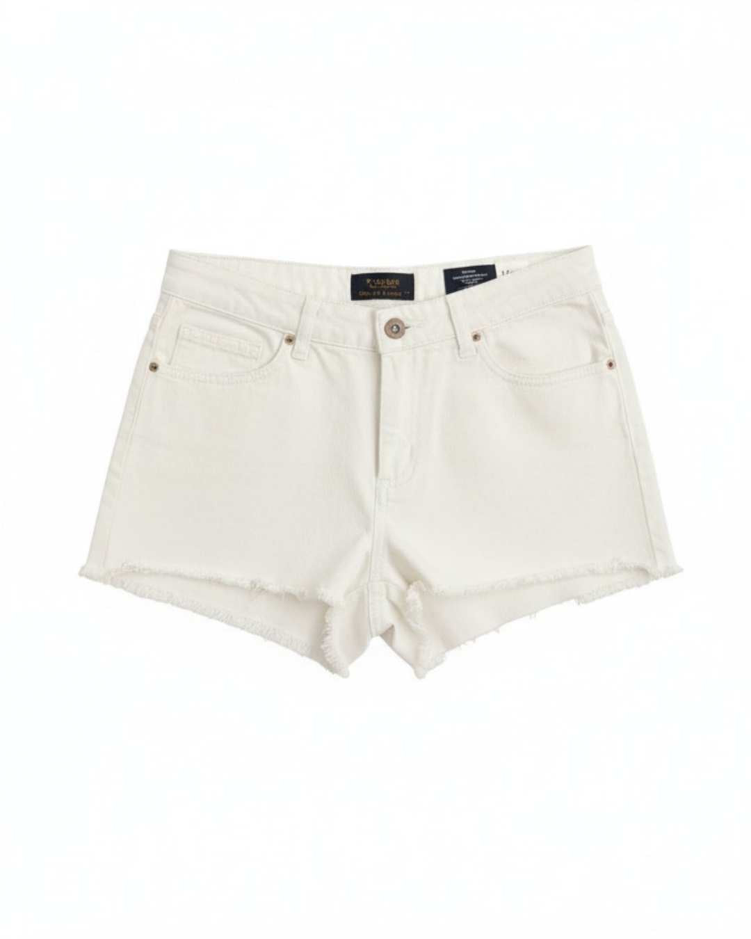 SHORT DENIM BLANCO CON RUEDO DESFLECADO Y CINCO BOLSILLOS EN UN BÁSICO DE VERANO.