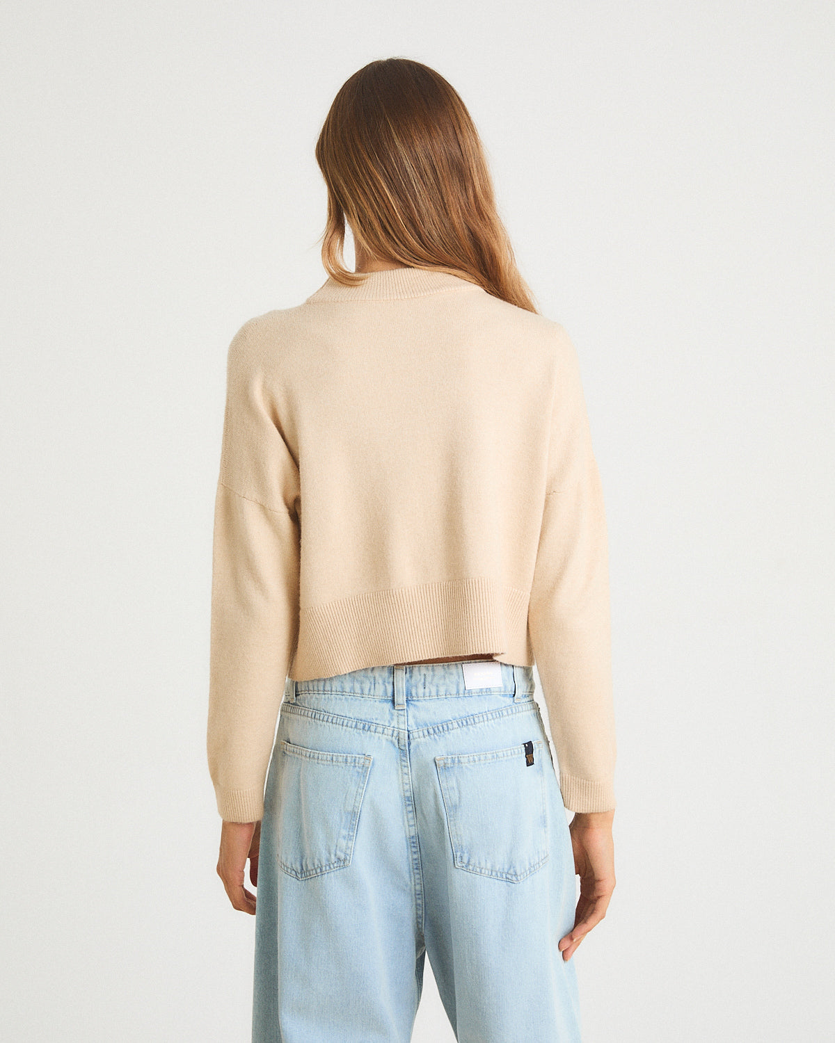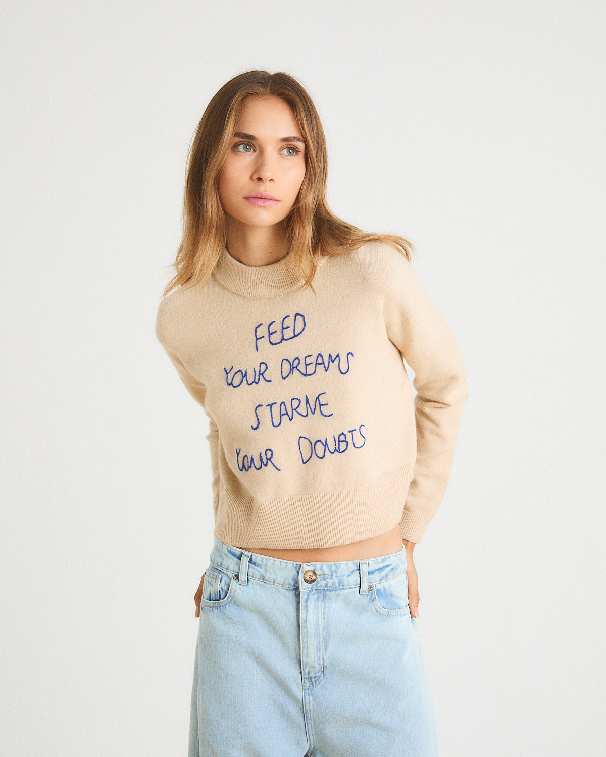 SWEATER CUELLO REDONDO LARGO A LA CINTURA CON FRASE BORDADA SOBRE EL TEJIDO.