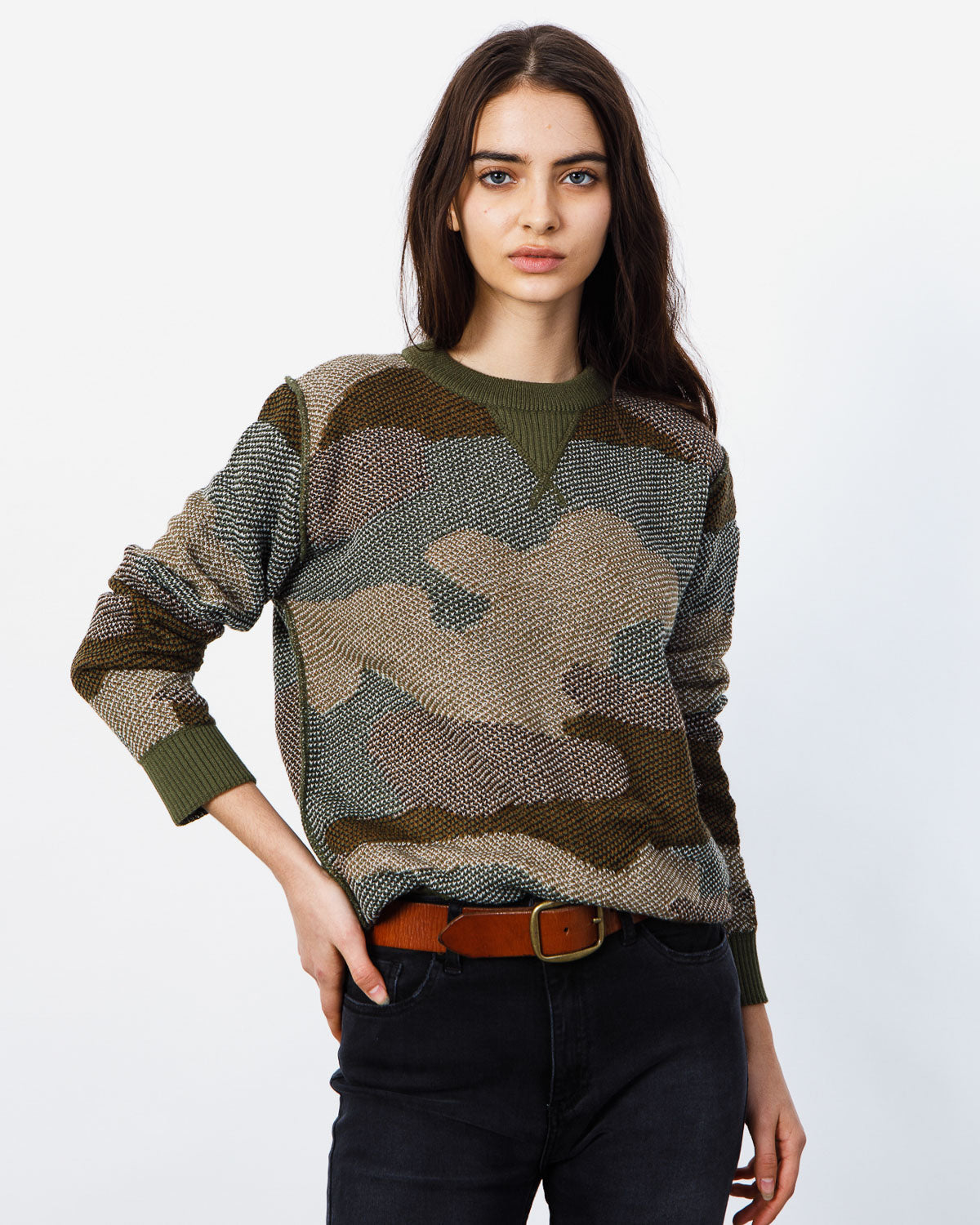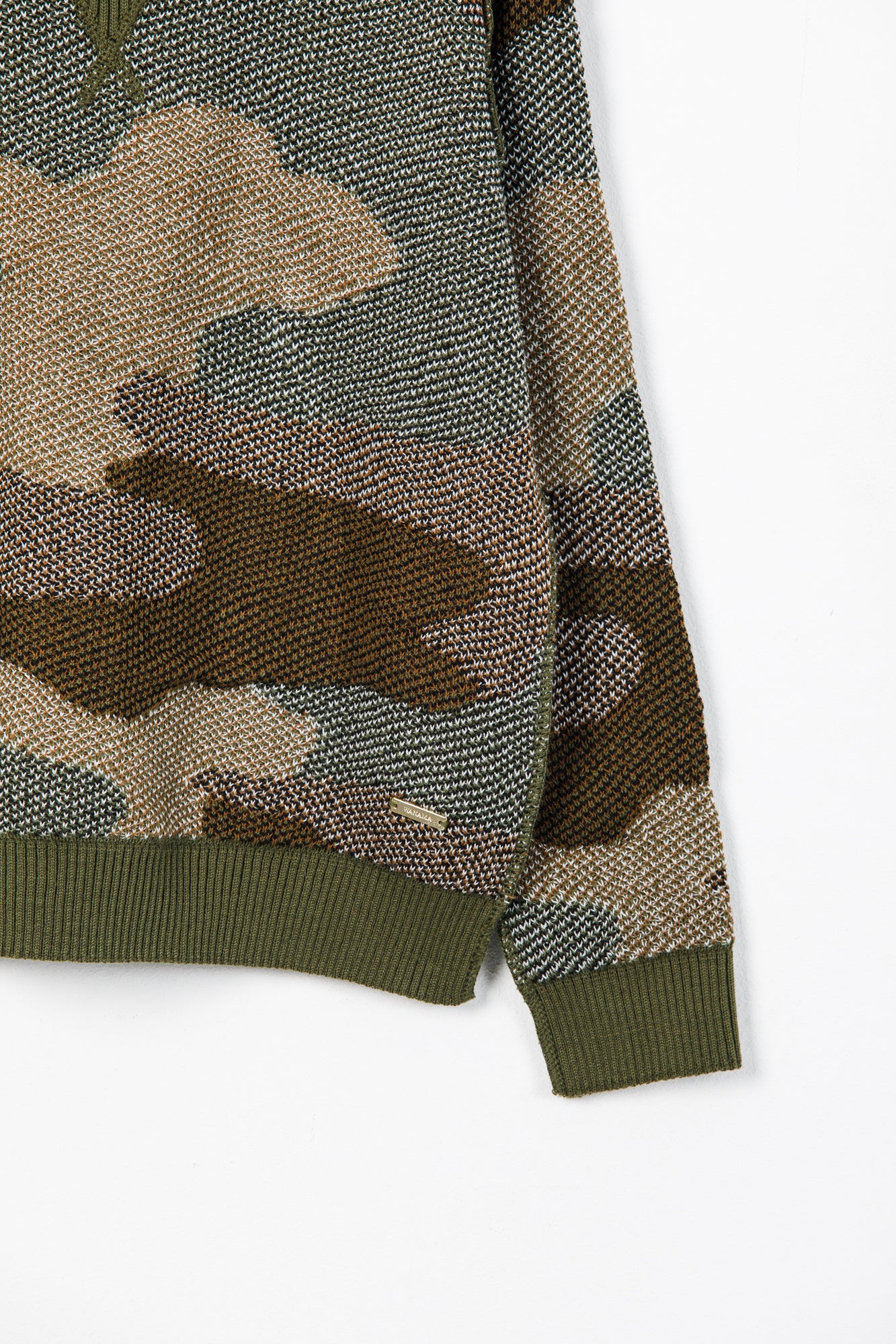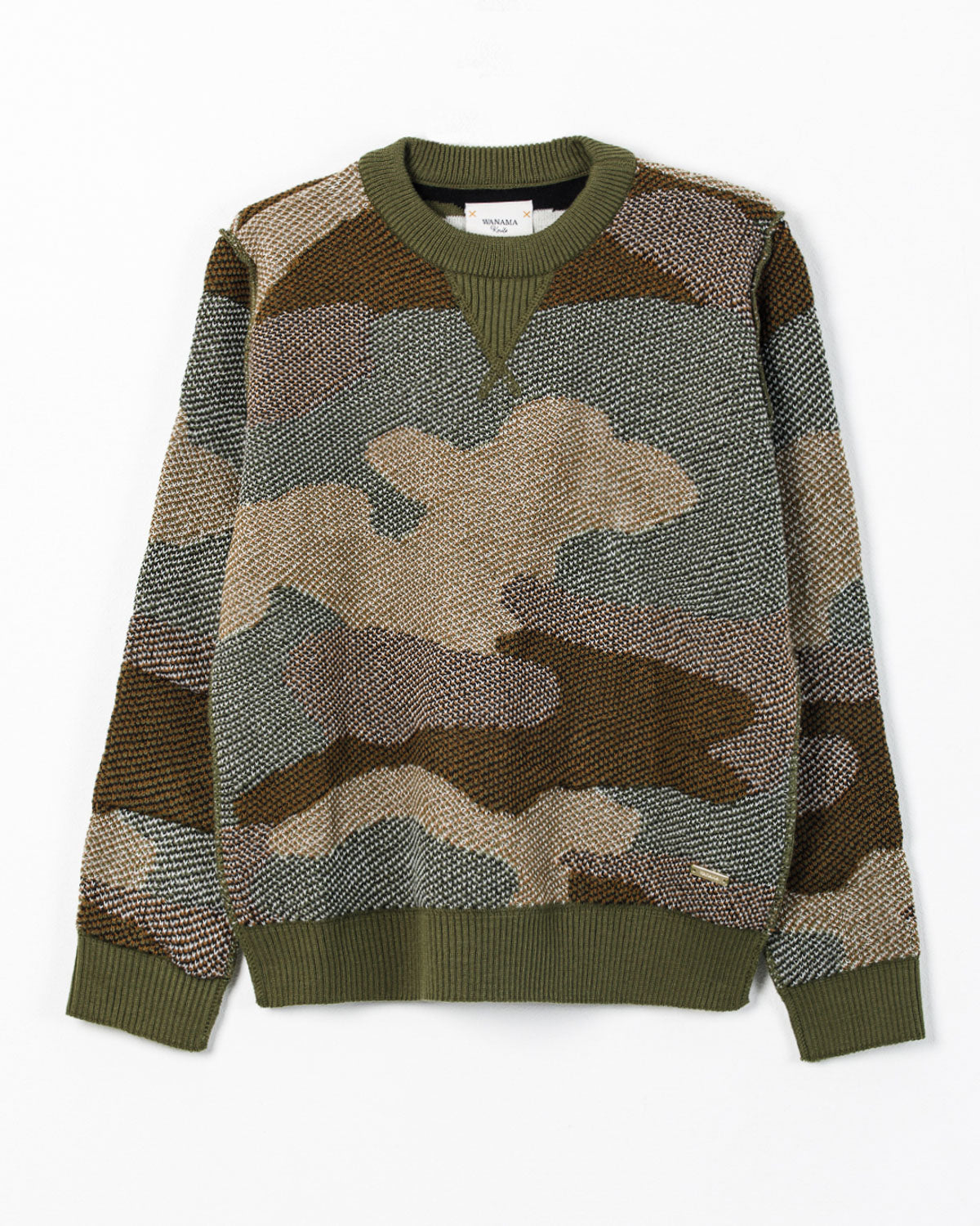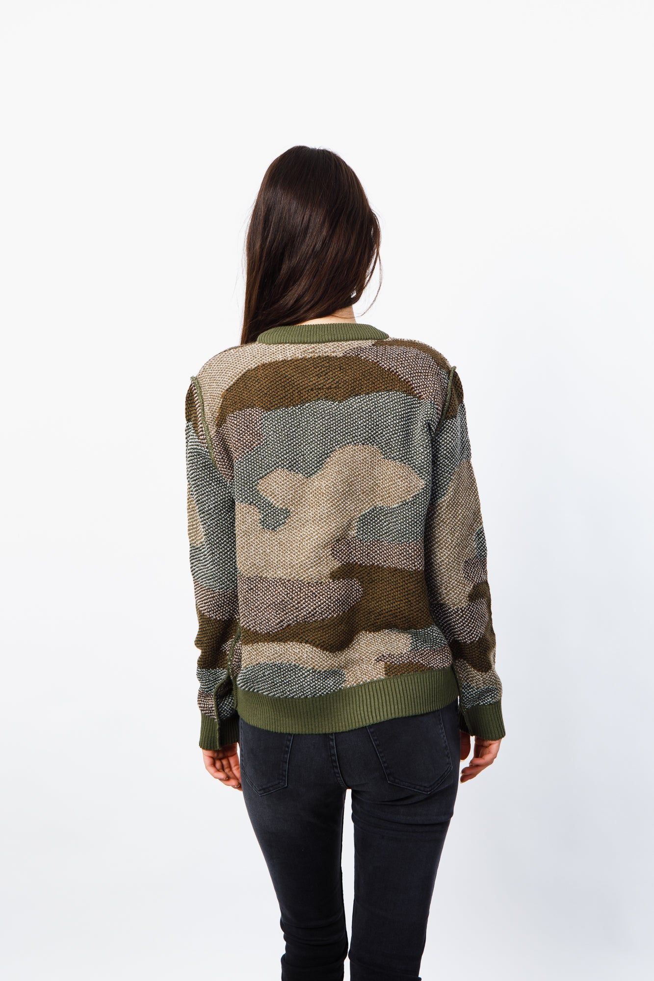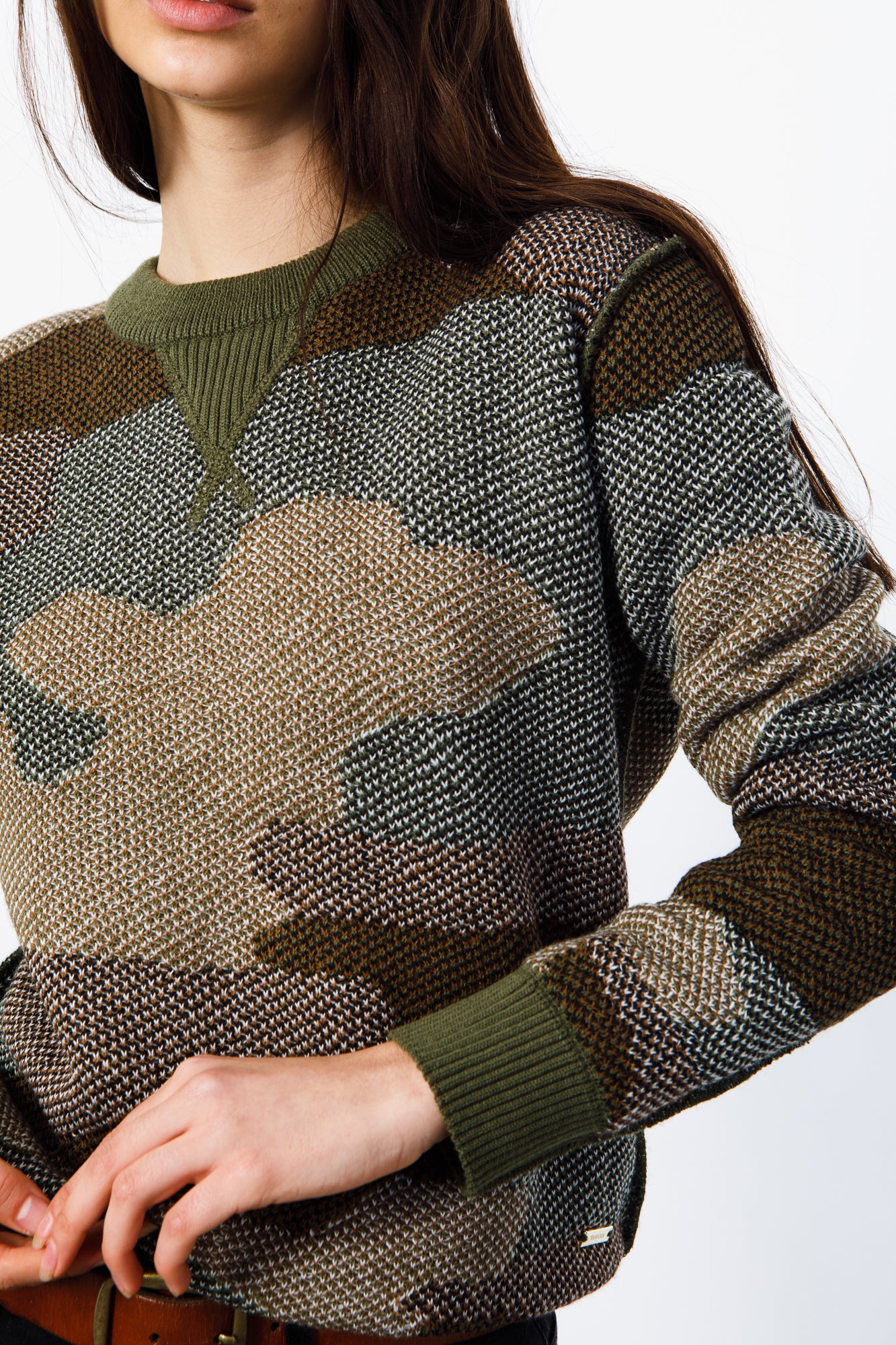 SWEATER TEJIDO EN HILADO DE ACRÍLICO, LIVIANO, CON CUELLO REDONDO, CAMUFLADO.