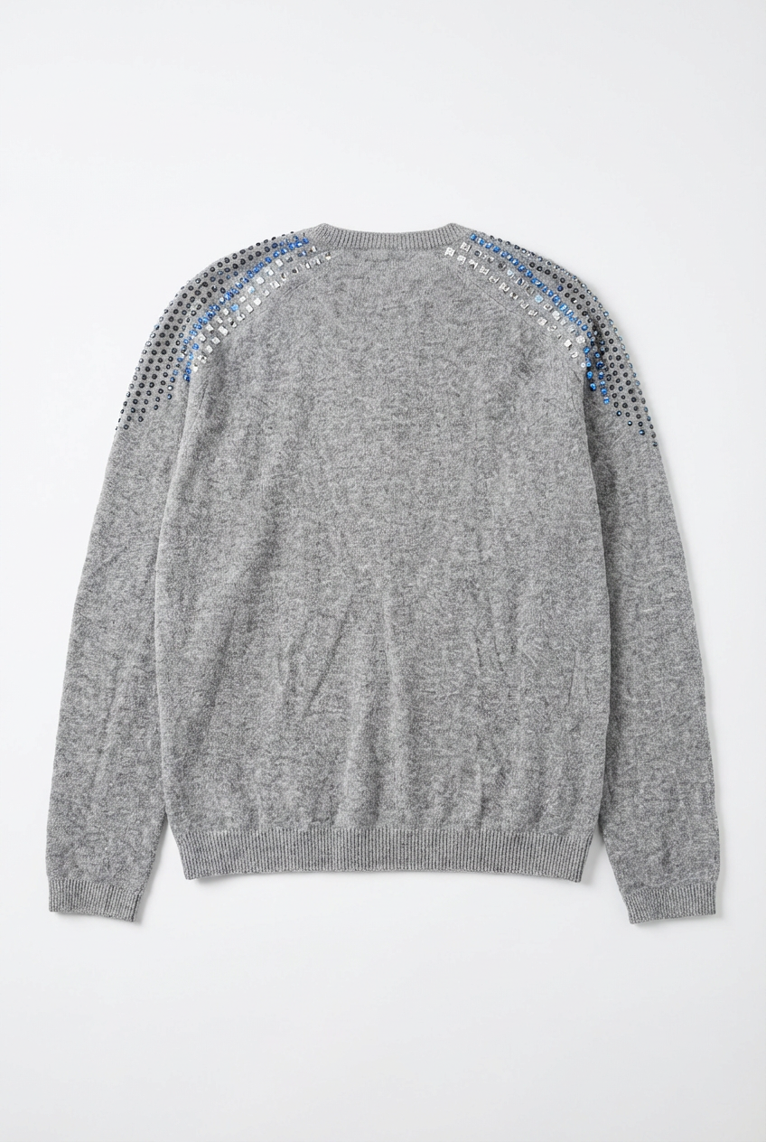 SWEATER DE CUELLO REDONDO CON UN DISEÑO DISTINTIVO. PRESENTA DETALLES DE APLIQUES EN TONOS NEGROS, AZULES Y PLATEADOS QUE RECORREN LOS HOMBROS Y PARTE SUPERIOR DE LAS MANGAS, DÁNDOLE UN TOQUE MODERNO Y ORIGINAL. SU CALCE CÓMODO Y SUS TERMINACIONES ACANALADAS LO HACEN IDEAL PARA COMBINAR CON DIFERENTES ESTILOS.