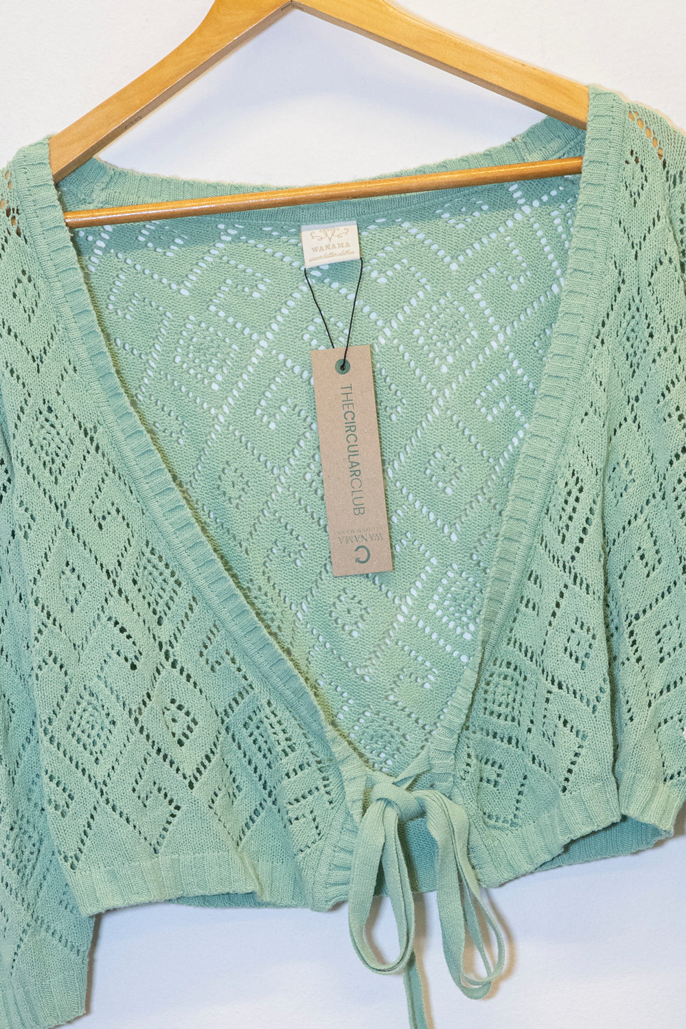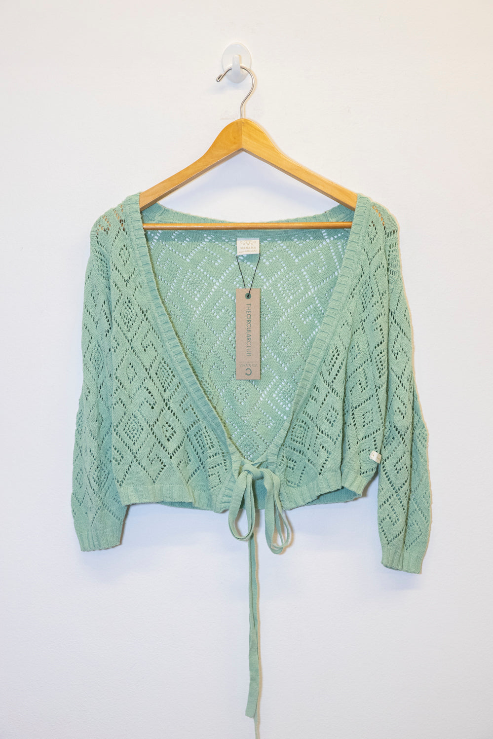 CARDIGAN CORTO HASTA LA CINTURA. CALCE REGULAR, TEJIDO CALADO. ACCESO DELANTERO ATADO.
