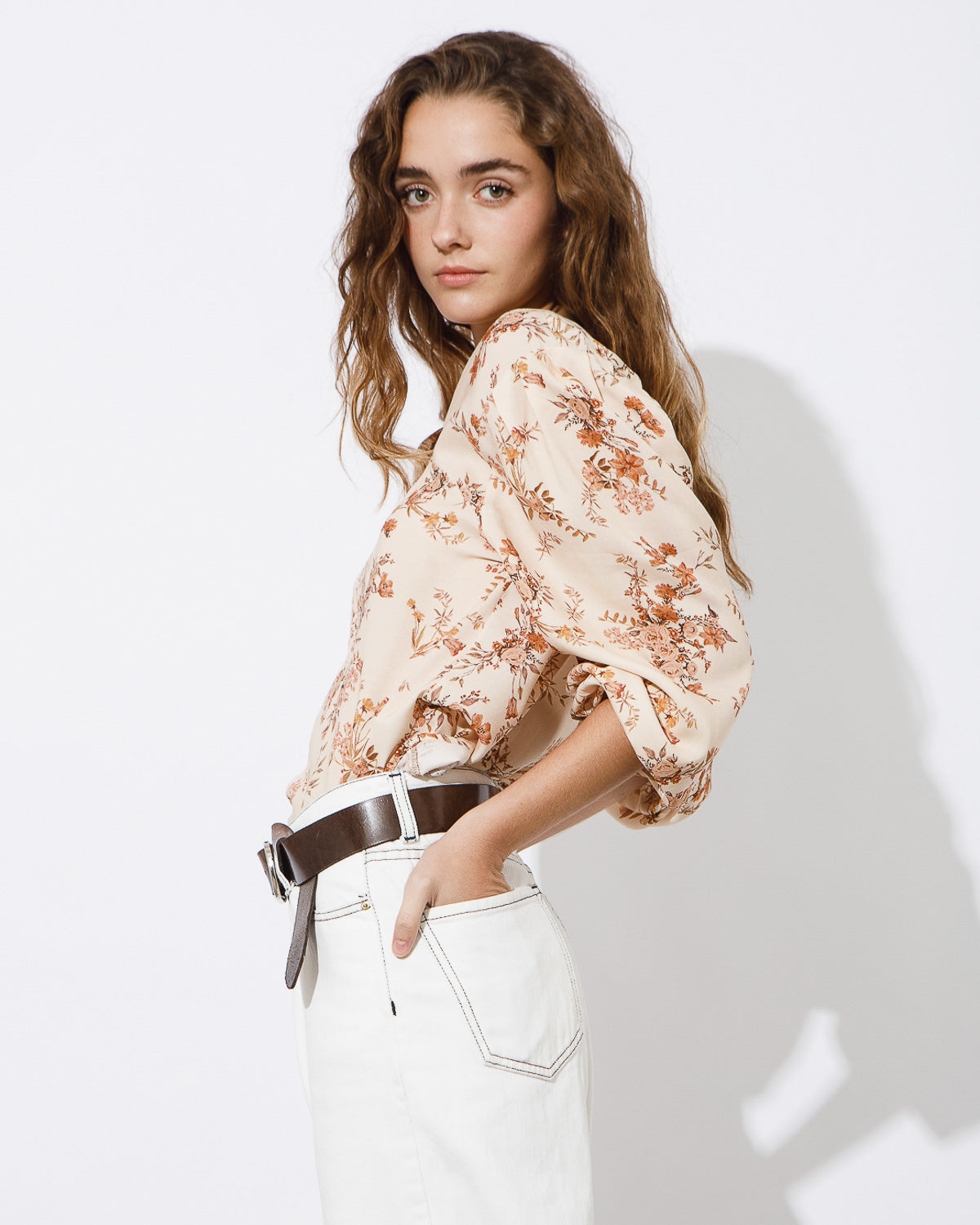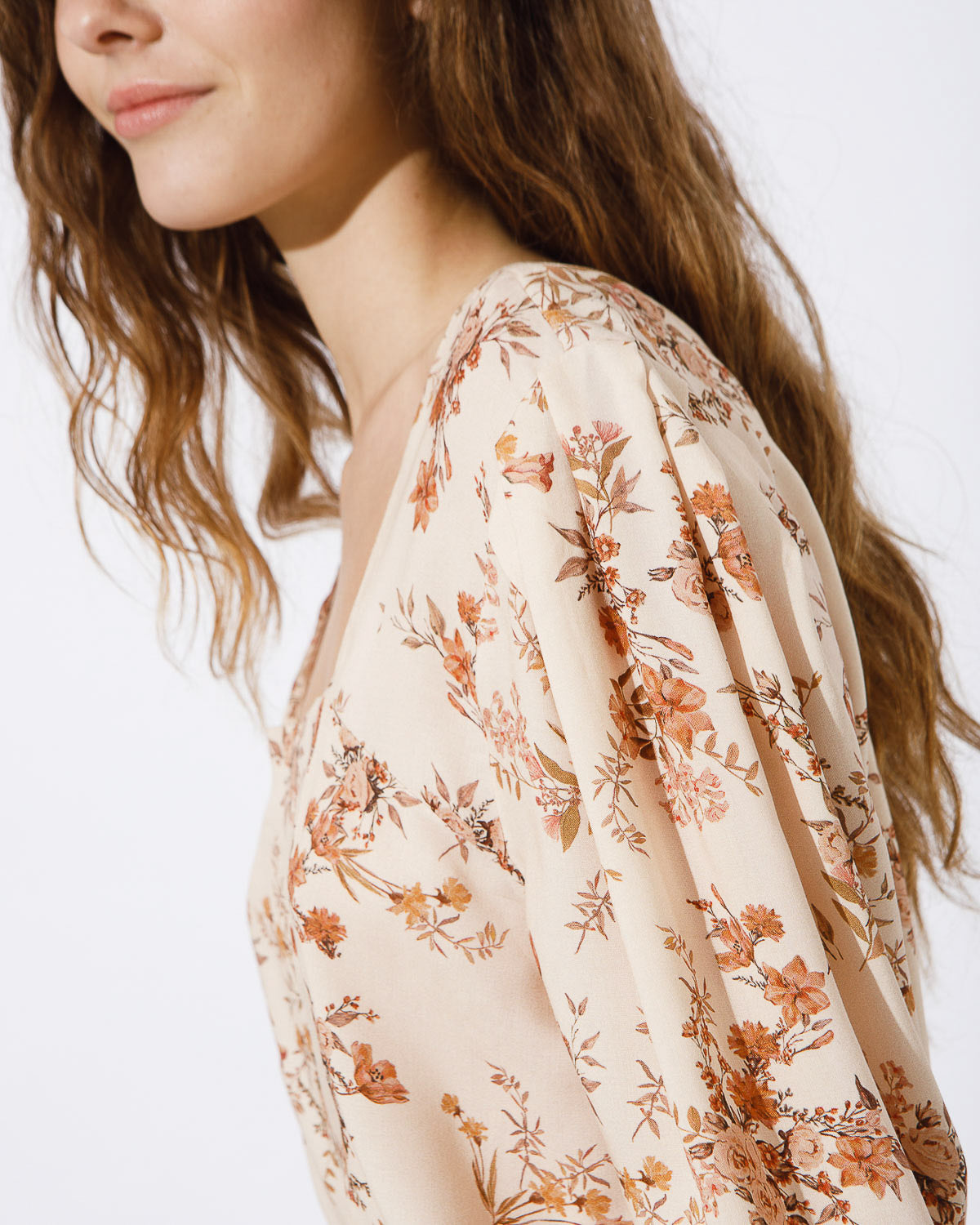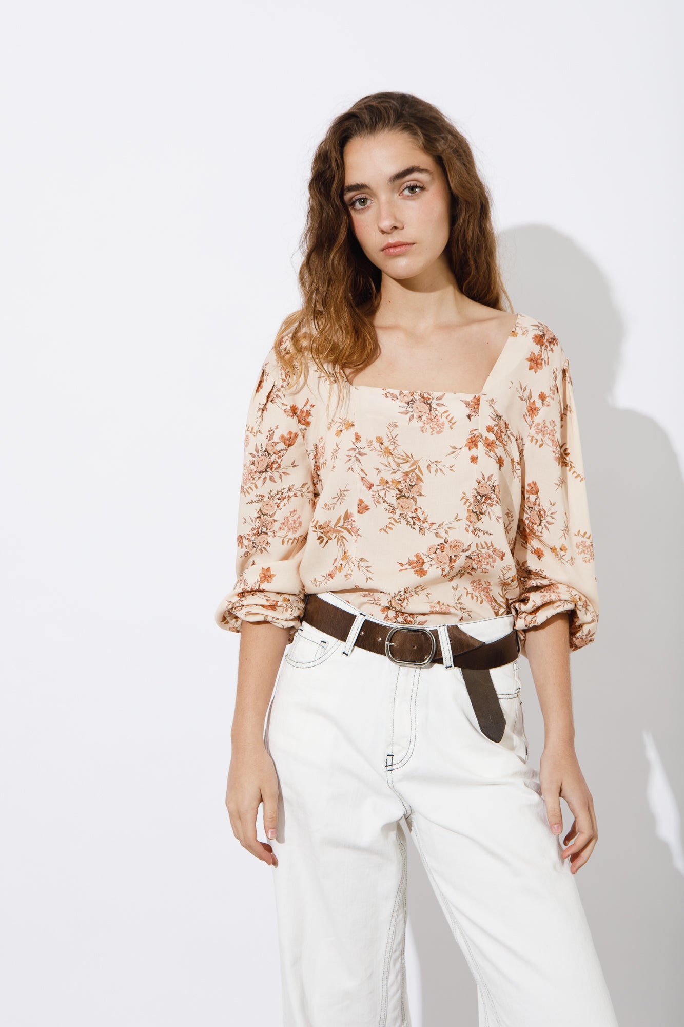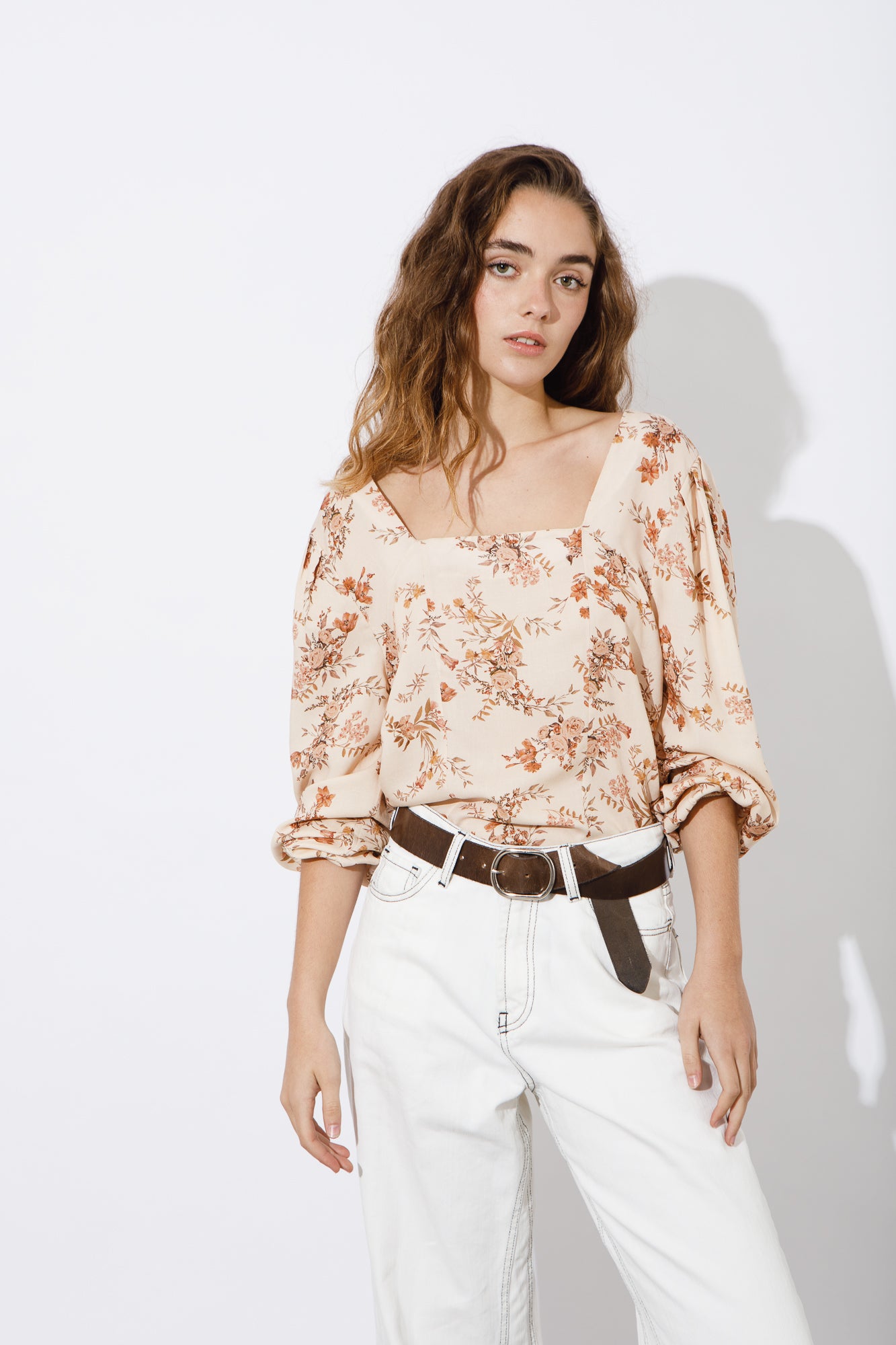 TOP ESTAMPADO, CON ESCOTE CUADRADO, MANGA CON VOLUMEN EN HOMBRO Y PUÑO CON ELASTICO.