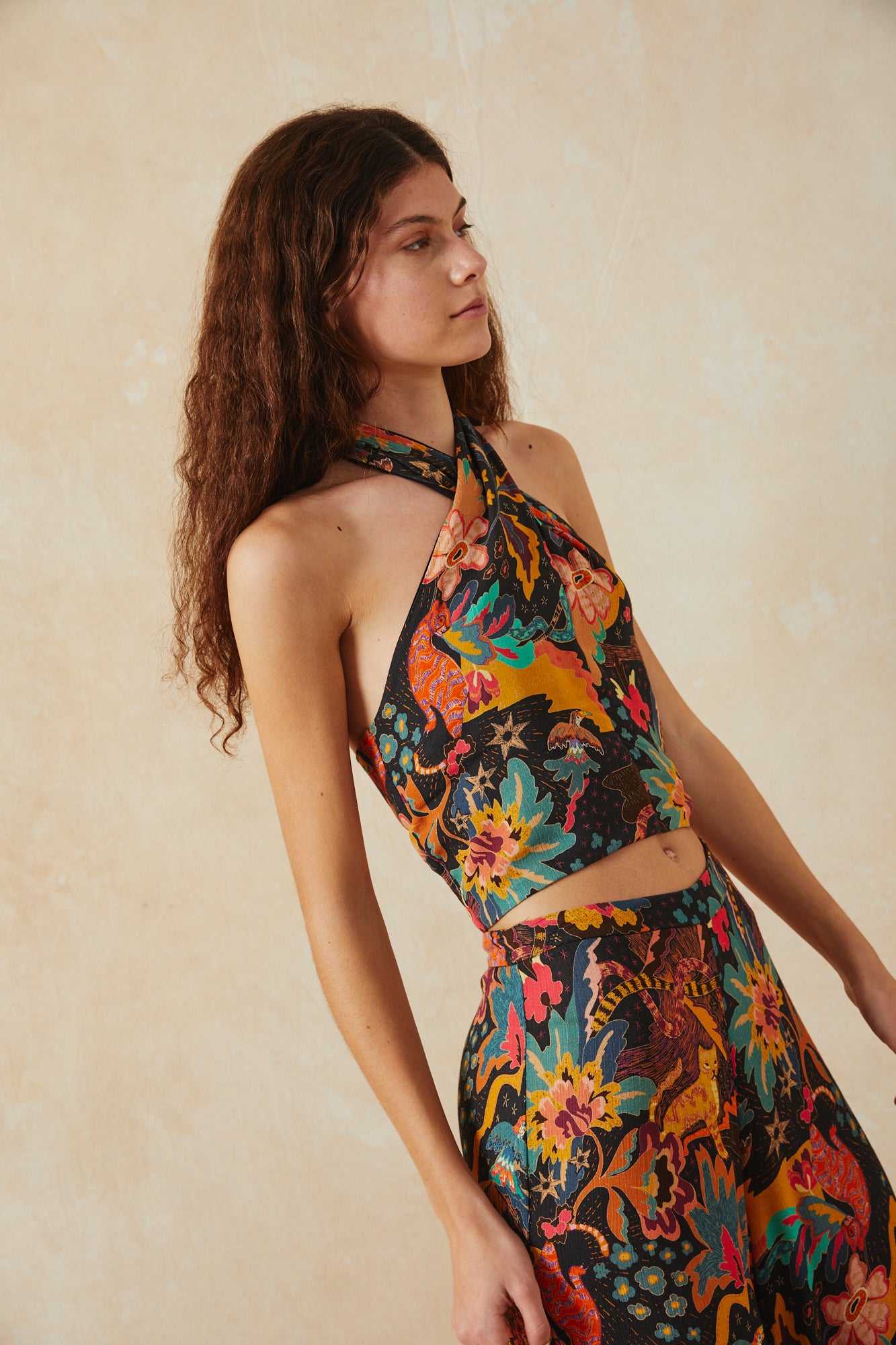 TOP CONFECCIONADO CON CUELLO HALTER CRUZADO PARA ATAR. POSEE UN CALCE AL CUERPO CON ESPALDA DESCUBIERTA Y DETALLE DE FRUNCIDO ELÁSTICO EN LA PARTE POSTERIOR QUE ASEGURA COMODIDAD Y UN AJUSTE ÓPTIMO. SU DISEÑO DESTACA POR LA ESTAMPA VIBRANTE EN TODO EL DELANTERO. UNA PRENDA VERSÁTIL Y MODERNA PARA CUALQUIER OCASIÓN ESPECIAL.