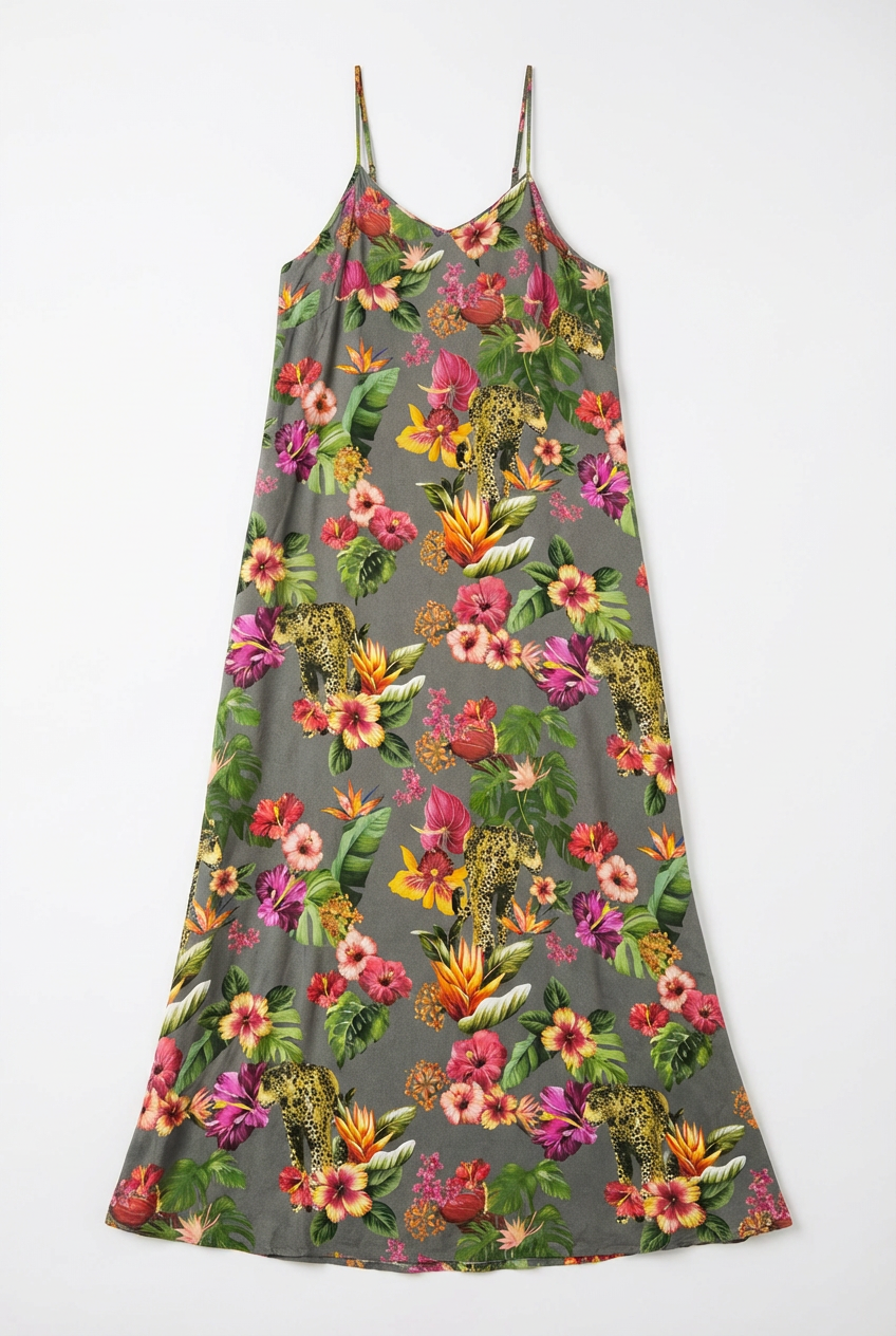 VESTIDO LARGO CON ESTAMPA TROPICAL Y DETALLES DE LEOPARDOS. PRESENTA ESCOTE EN V Y BRETEL FINOS REGULABLES PARA UN AJUSTE OPTIMO. LA FALDA CUENTA CON UNA ABERTURA LATERAL QUE APORTA FLUIDEZ AL CAMINAR. UNA PIEZA VERSATIL DE SILUETA RELAJADA, PERFECTA PARA COMPLETAR UN LOOK DE VERANO CON UN TOQUE EXOTICO.