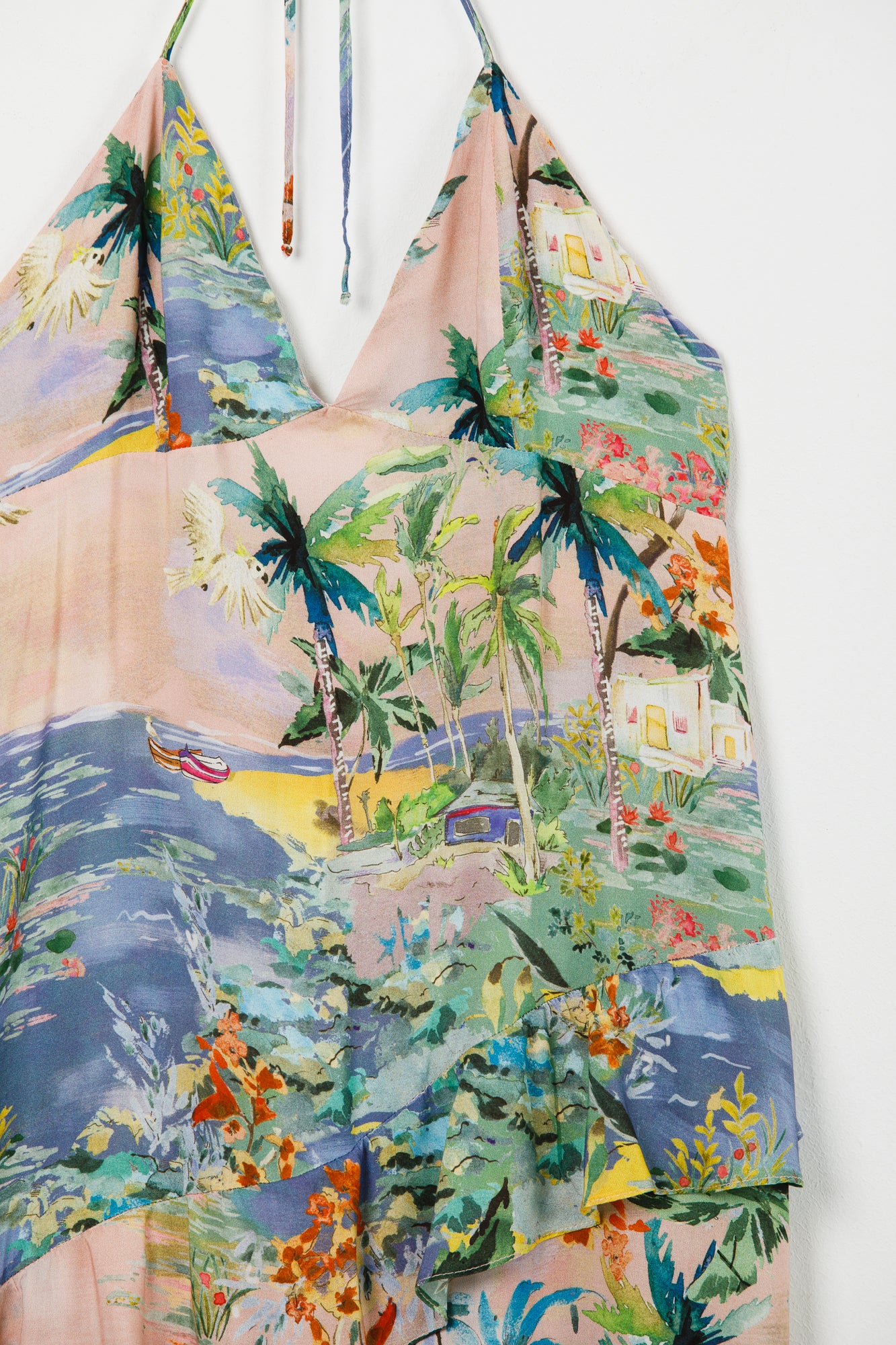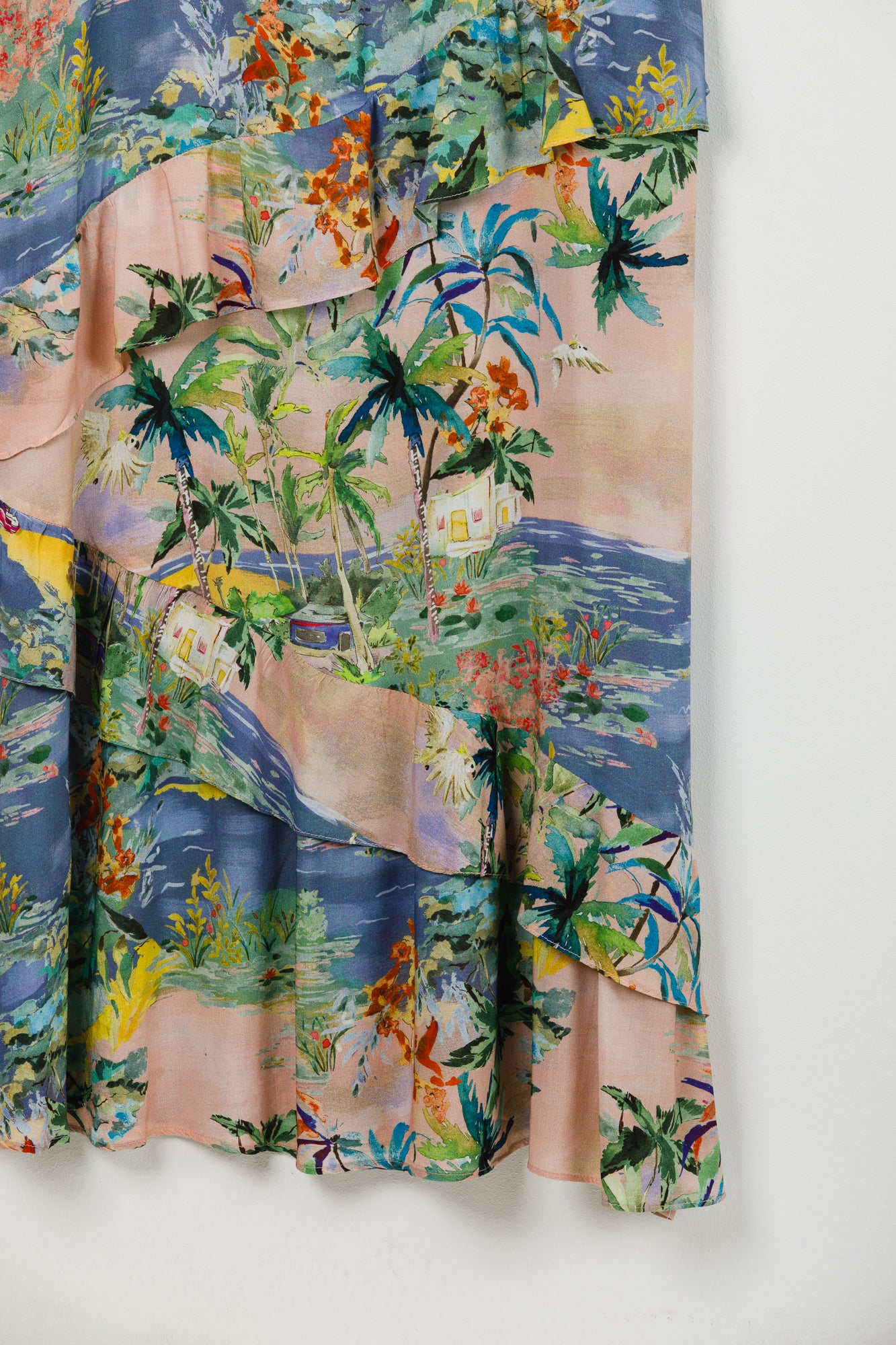 VESTIDO CONFECCIONADO EN VOILE DE VISCOSA ESTAMPADO, FRESCO Y LIVIAO. CALCE SUELTO CON VOLADOS. INGRESO LATERAL POR CIERRE Y BRETELES REGULABLES.