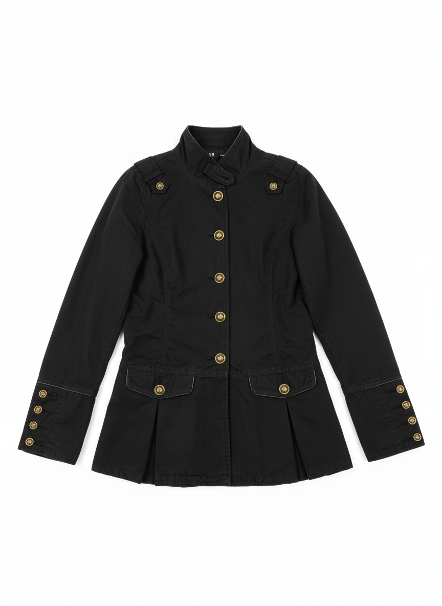 SACO NEGRO PROFUNDO CON DOBLE FILA DE BOTONES DORADOS Y CORTE ENTALLADO DE AIRE MILITAR.