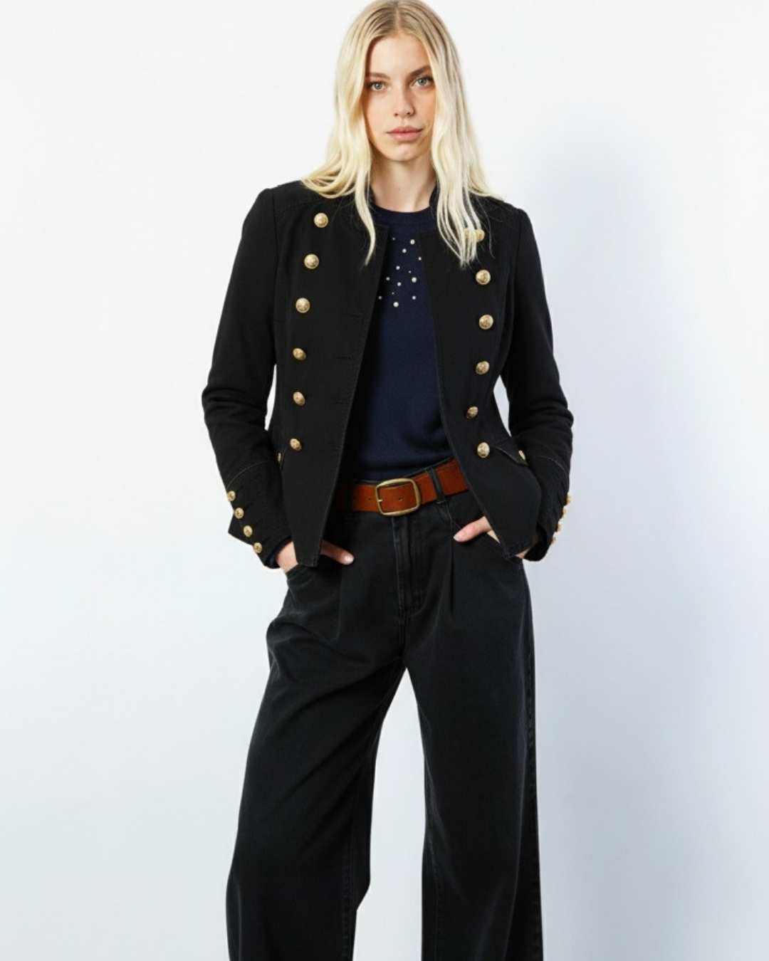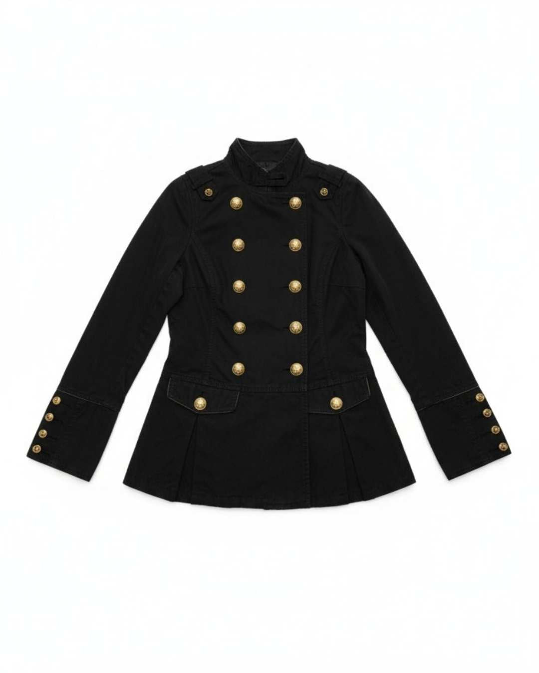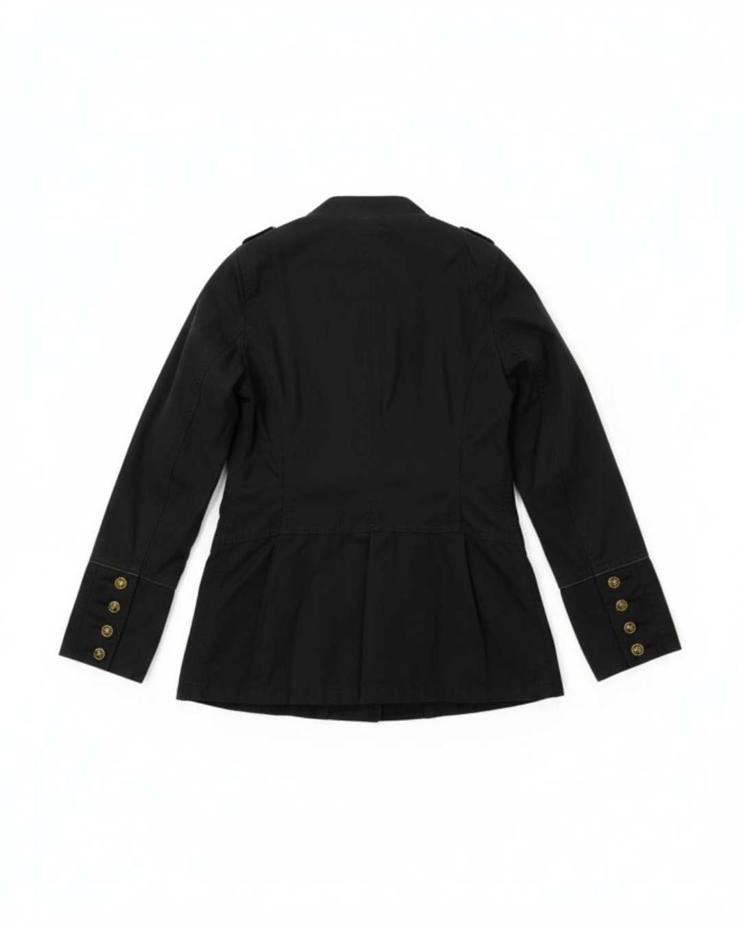 VESTIDO NEGRO PROFUNDO CON DOBLE FILA DE BOTONES DORADOS Y CORTE ENTALLADO DE AIRE MILITAR.